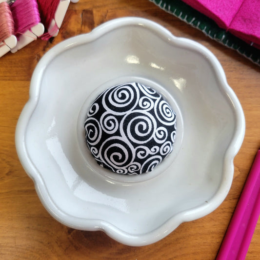Flower Shaped Pincushion and Sewing Notions Holder in Black White Swirl