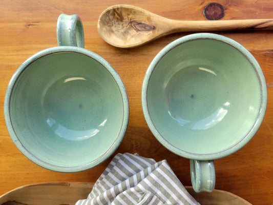 Cyber Monday DealSoup and Cereal Bowls Handmade Pottery Country Style Handled in Green
