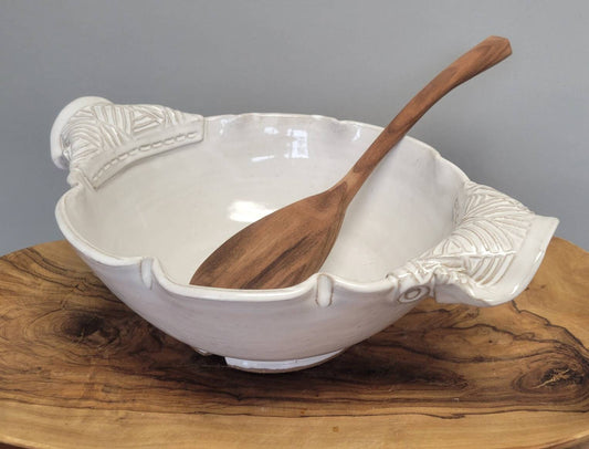 Large Scalloped Serving Bowl with Geometric Textured Handles White