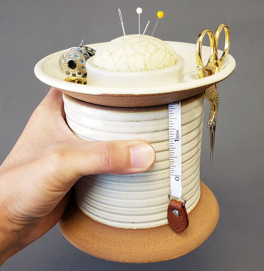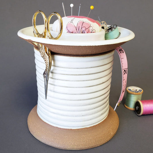 They serve different purposes. The Sewing Caddy is your main organizer for tools and notions. The Pincushion Dish keeps pins, clips and hand-sewing tools contained beside your machine or ironing board. Many sewists keep one at the cutting table and one at the machine for smoother workflow.