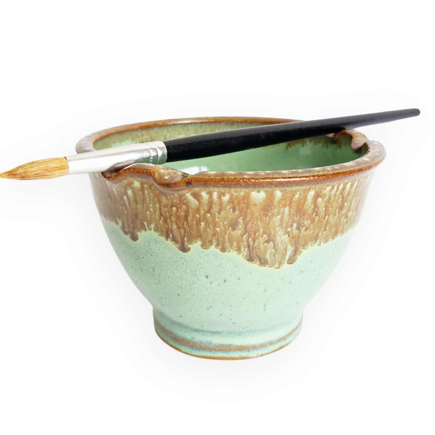 This versatile set includes a painter's brush rinse bowl, designed with two brush rests for seamless transitions between multiple paintbrushes or artistic tools. Accompanying it is the coordinating brush caddy, available in an array of hues, allowing you to personalize the ultimate artist's sanctuary. Both pieces are crafted with love on the potter's wheel, using durable stoneware clay, ensuring they're both aesthetically pleasing and exceptionally easy to clean, as they are dishwasher safe.