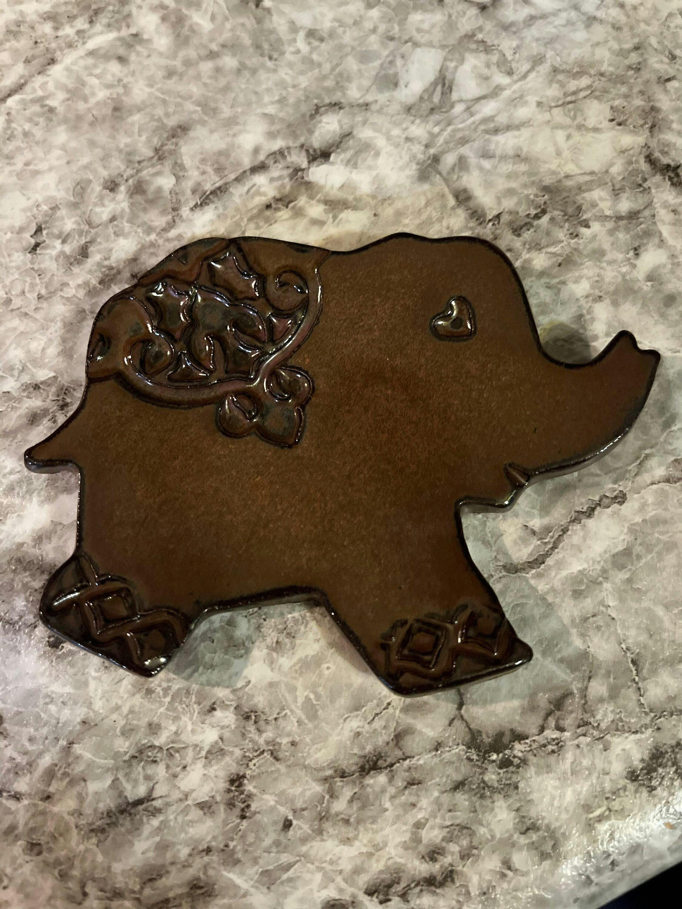 Spice up your coffee bar in some exotic style with our handmade elephant-shaped spoon rest! Our spoon rest is perfect for coffee and tea drinkers who want to make each cup of tea or cocoa special. This elephant's charming smile and exotic heart shaped eye is sure to bring a smile to your face every time you use it. This fits a standard kitchen teaspoon (shown) and can also be used for a trinket dish or ring holder. Just as each elephant in nature is different, textures on each piece may vary, making each one truly one-of-a-kind. Our spoon rest is microwave and dishwasher safe, making it easy to clean and use every day. It’s also the perfect size to sit next to your coffee maker, adding a pop of color and delight to your morning routine. Order now and complete your beverage station with our handmade spoon rest!