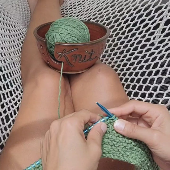 This handmade pottery yarn bowl is crafted of durable ceramic stoneware and has a smooth surface for your yarn to glide over. It’s decorative and practical for your crafting room and is handmade. The word “Love” is hand carved into the side of the bowl, making it a unique and special addition to your crafting supplies.