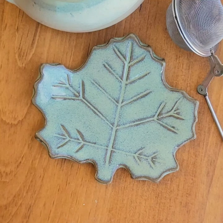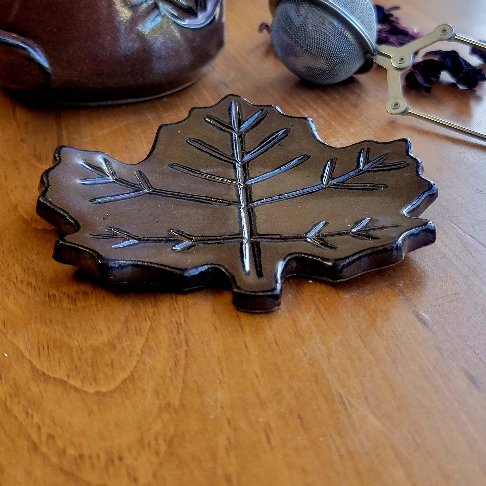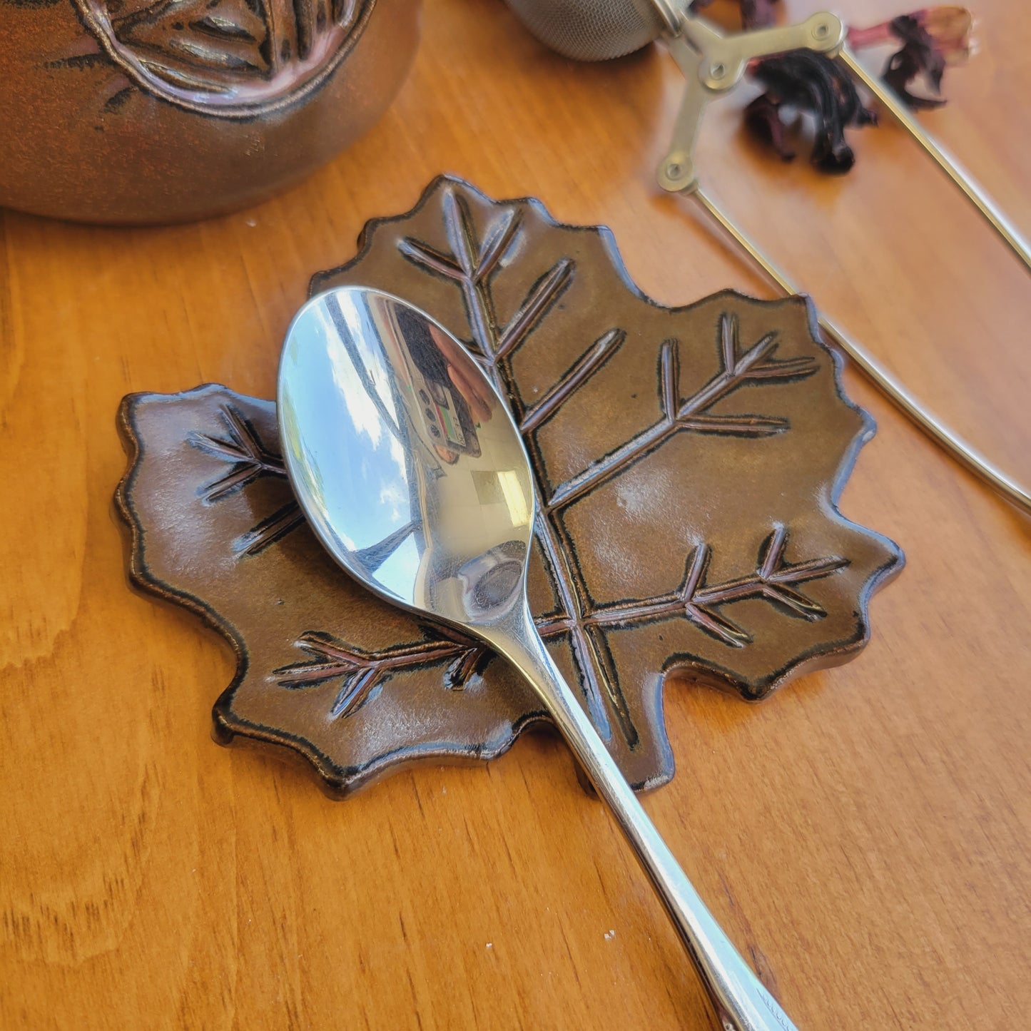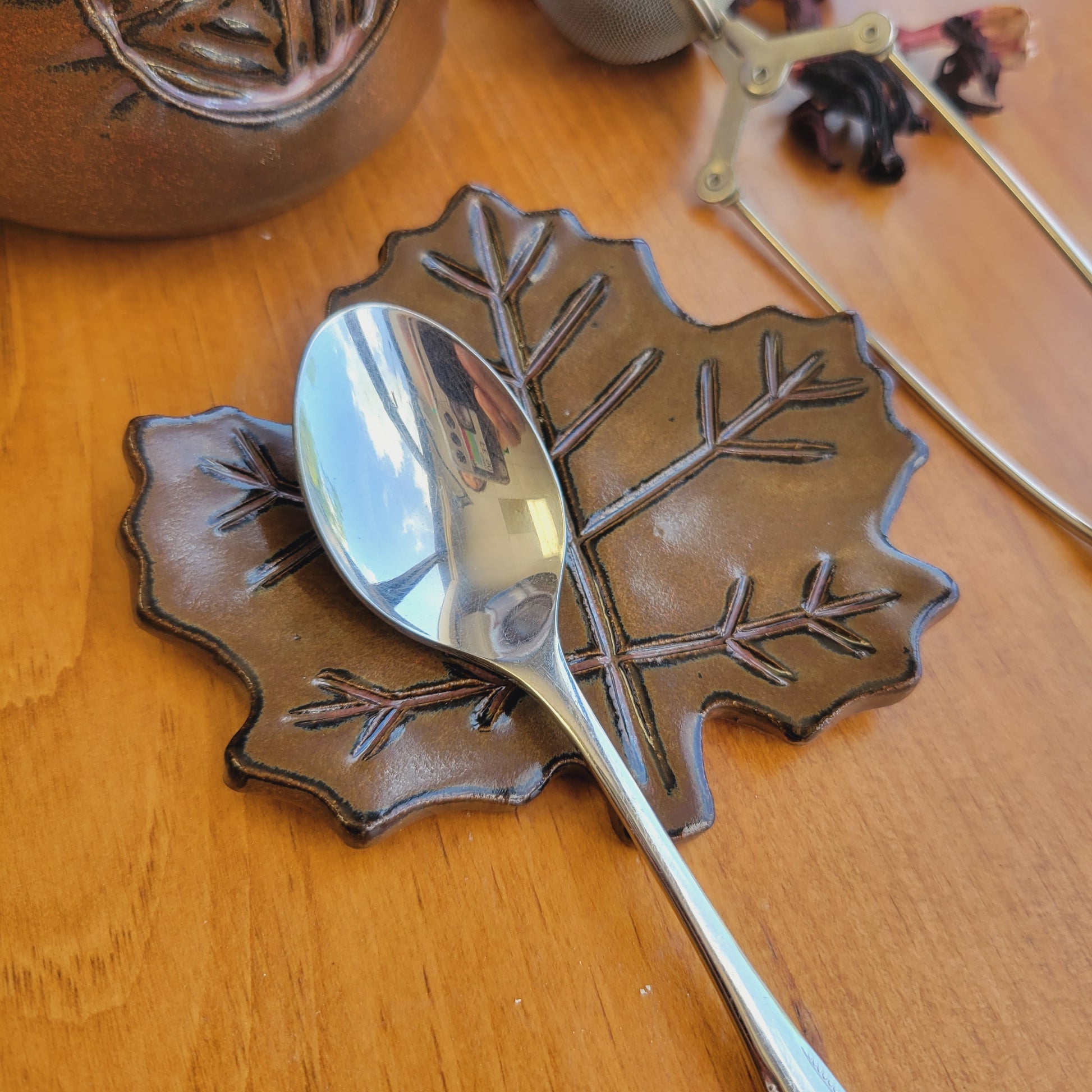 Add a touch of rustic charm to your coffee bar with our handmade Maple Leaf shaped spoon rest! Our spoon rest is perfect for coffee and tea drinkers who want to make each cup of tea or cocoa special. The earthy maple leaf shape and rich brown finish is sure to bring a smile to your face every time you use it. They fit a standard kitchen teaspoon (shown) and can also be used for a trinket dish or ring holder. Just as each leaf has unique features, textures on each piece may vary, making each one truly one-of-a-kind. Our spoon rest is microwave and dishwasher safe, making it easy to clean and use every day. It’s also the perfect size to sit next to your coffee maker, adding a pop of color and delight to your morning routine. Order now and complete your beverage station with our handmade spoon rest!