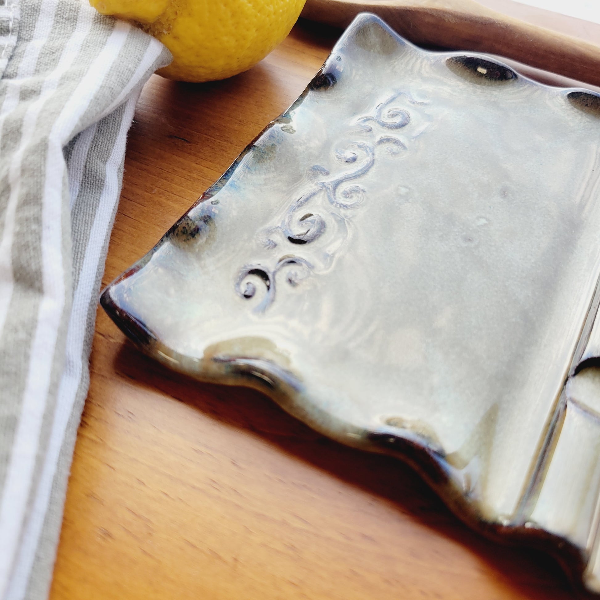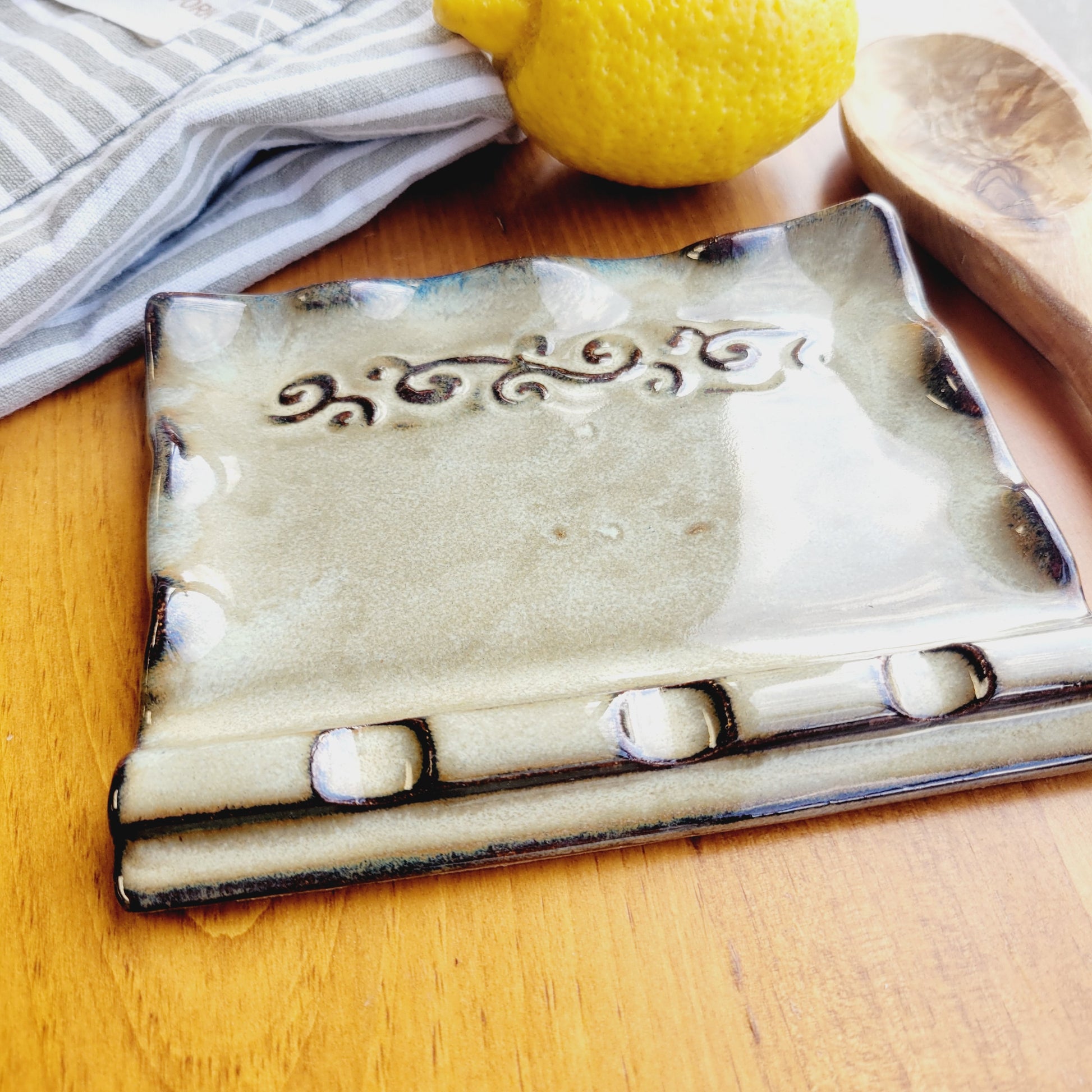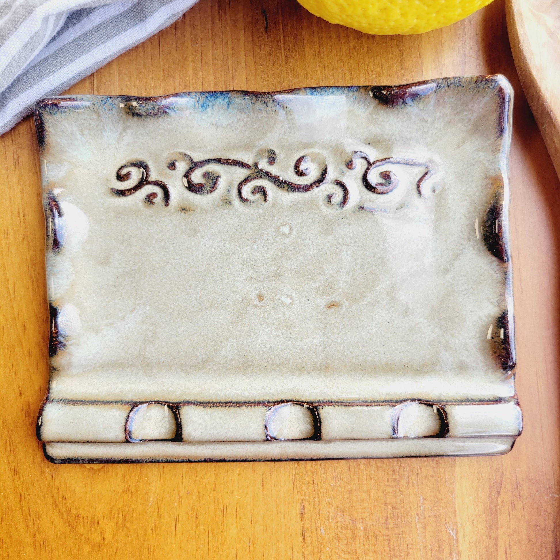 Looking for a way to add some warmth and charm to your kitchen? This beautiful spoon rest is the perfect addition! Handmade from hazelnut brown stoneware clay, it features a scalloped edge and swirly pattern that will add a touch of elegance to any kitchen. With three notches for utensils, it’s both practical and compact, so it won’t take up too much counter space.