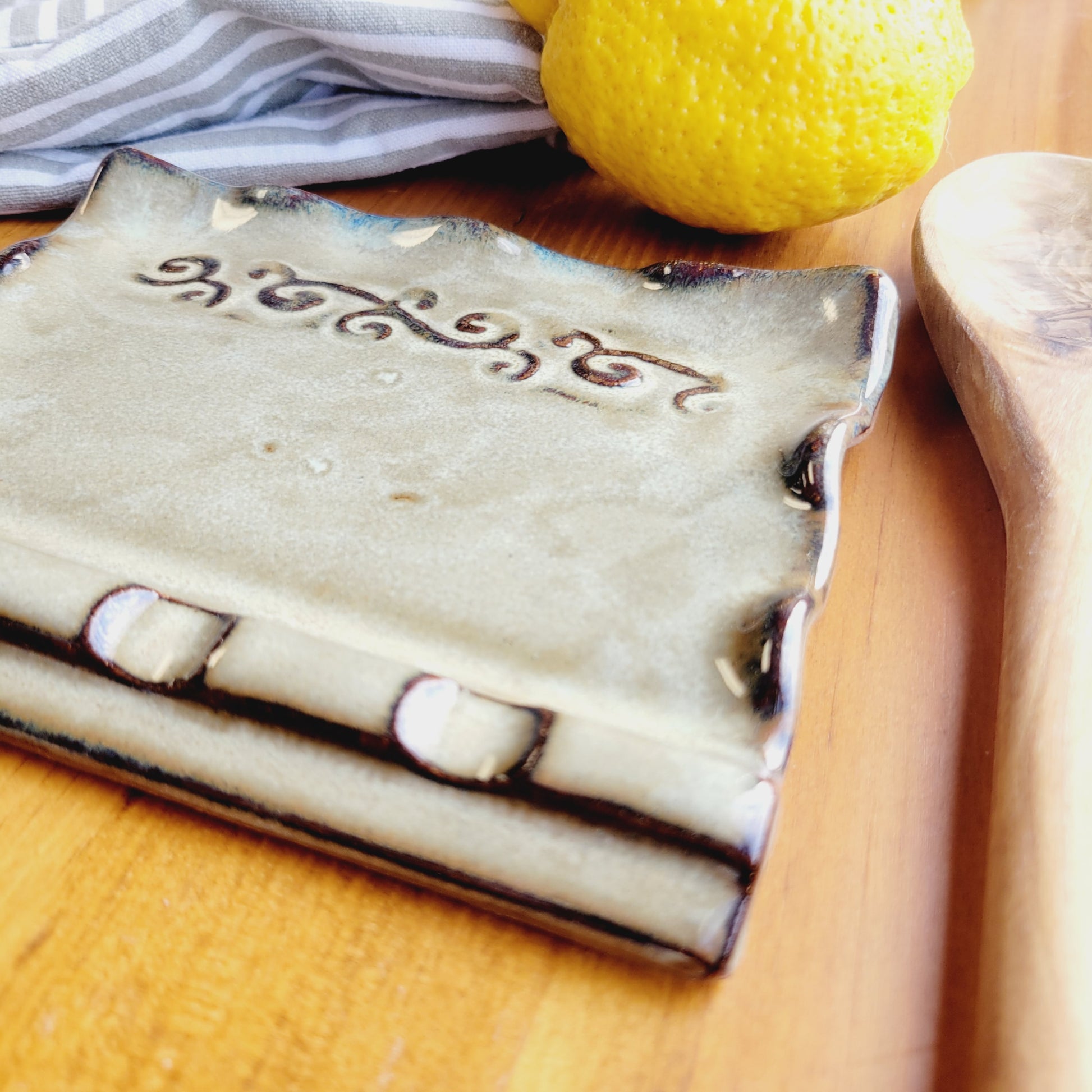 Give your stovetop a timeless cottagecore touch with this handmade triple spoon rest in warm brown stoneware. Perfect for cooks who want beauty and practicality, it keeps multiple utensils contained while adding rich, earthy texture to your kitchen. A thoughtful housewarming or hostess gift for anyone who loves cozy, well-made home goods.