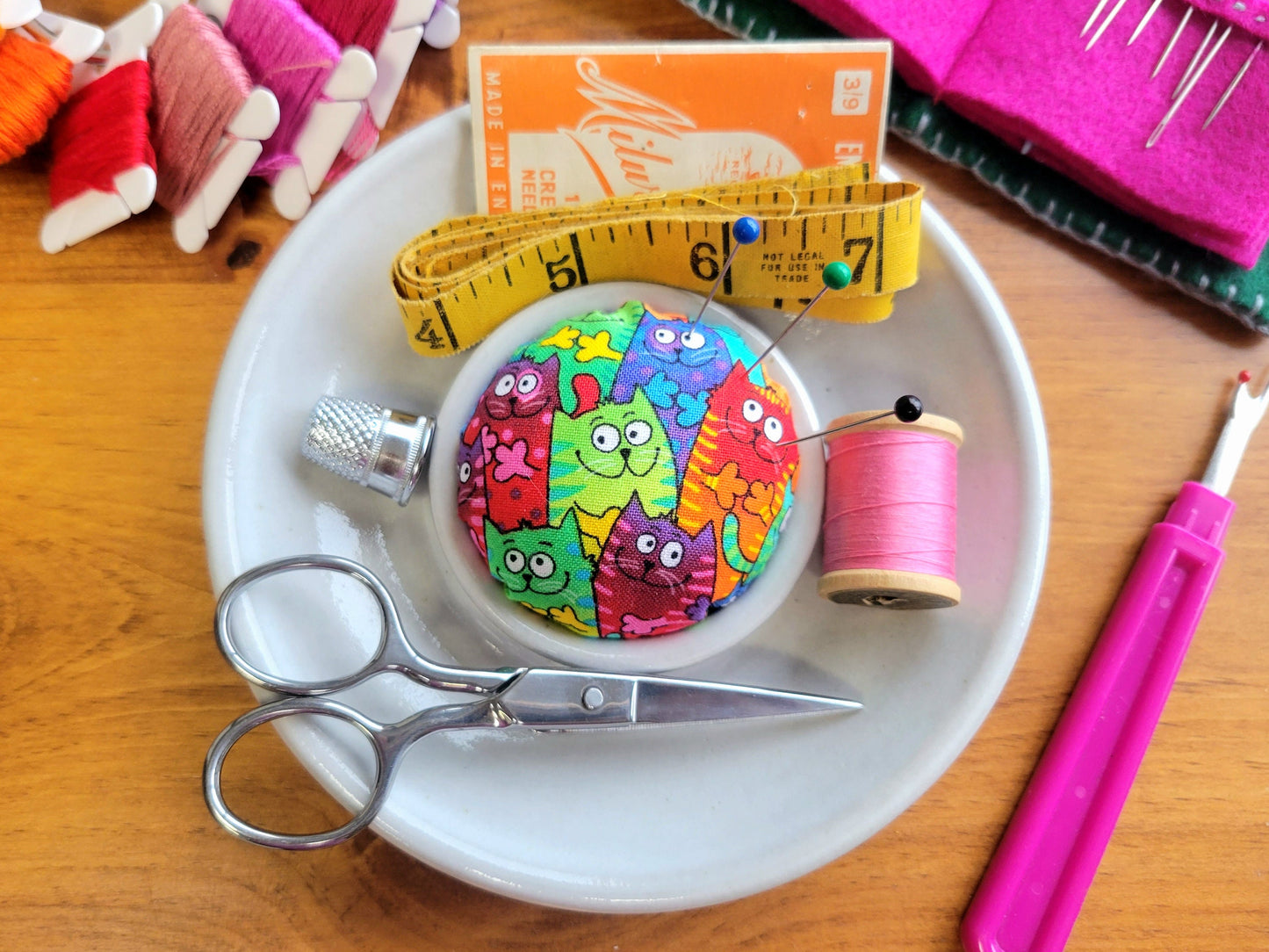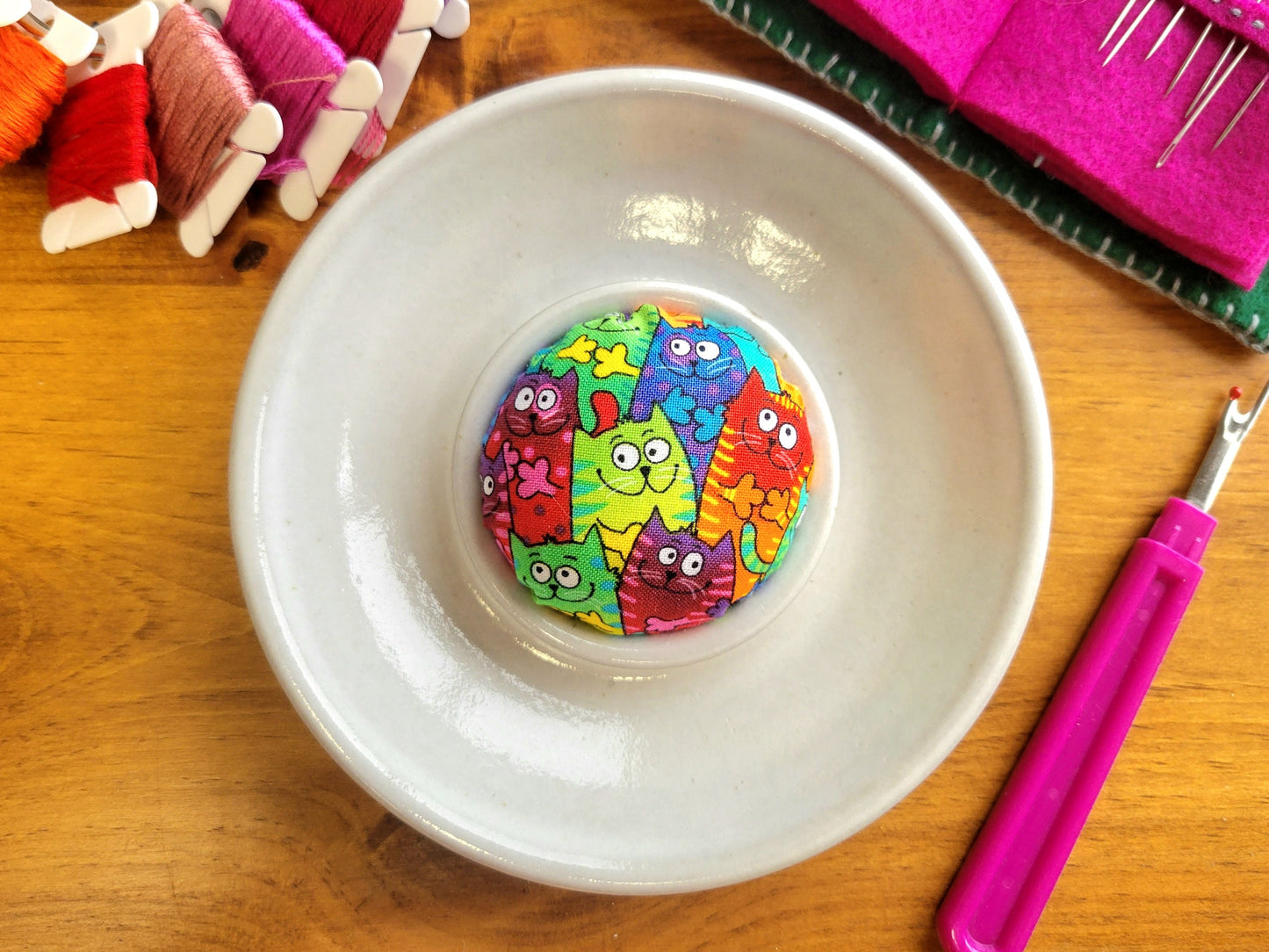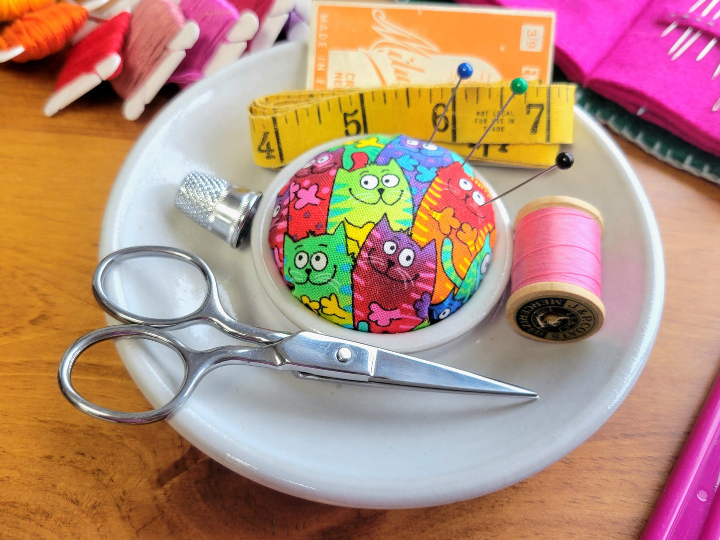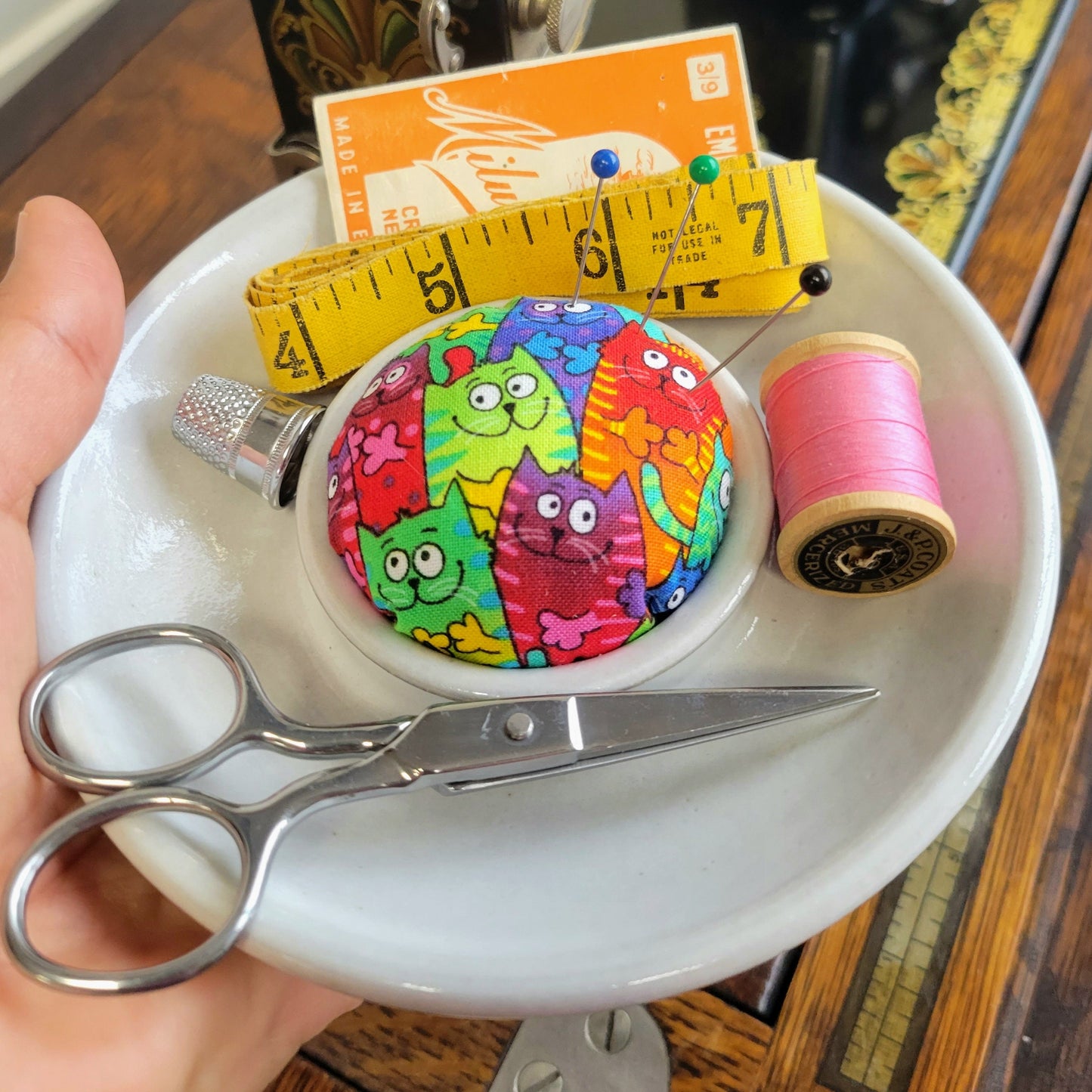 Looking for a cute gift for the sewist, quilter, or crafter in your life? Our sweet sewing dish is the perfect addition to any creative sewing space. It features built-in storage for bobbins, sewing notions, pins, and needles, this dish will help keep your sewing area organized and clutter-free. Imagine the ease of diving into your next project while having all your go-to tools at your fingertips. The pincushion is filled with 100% wool to keep pins protected and sharp. Plus, the pincushion is covered in a vibrant Rainbow Cat print. Don’t miss out on this must-have accessory for any sewing enthusiast - order now and enjoy a more organized workspace!