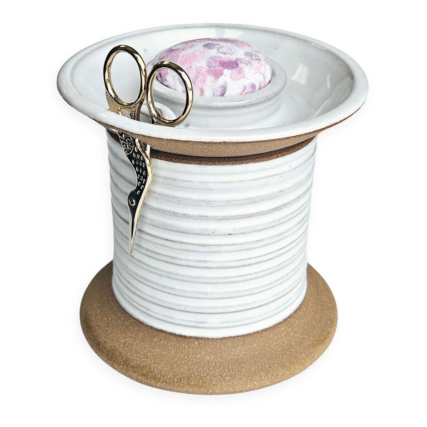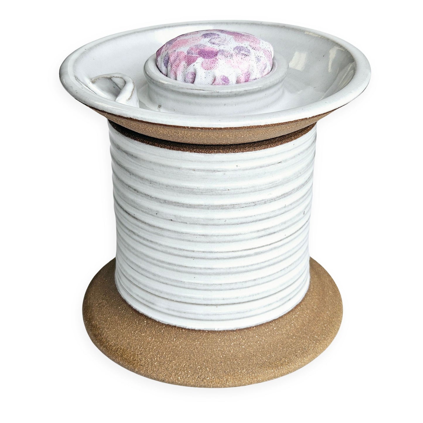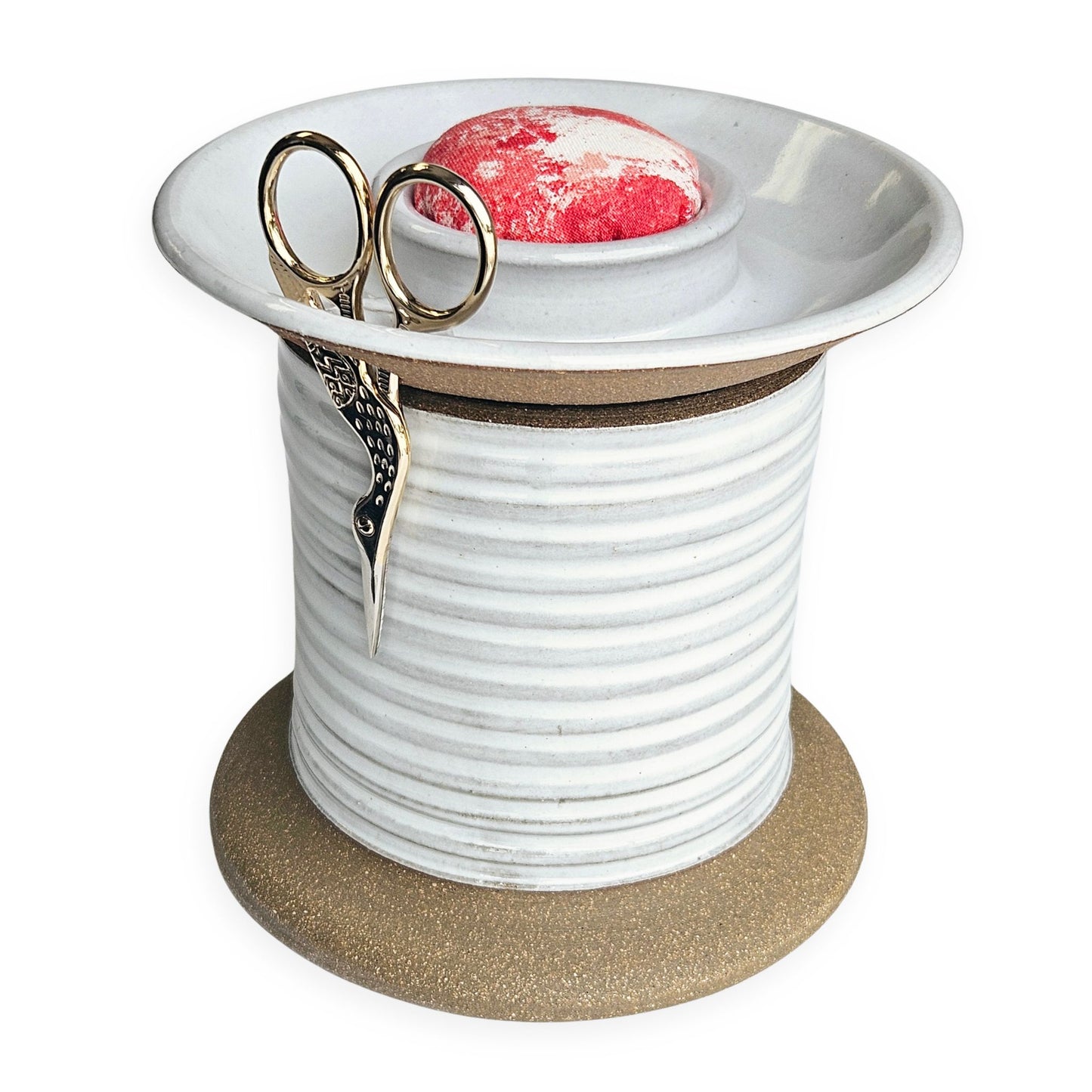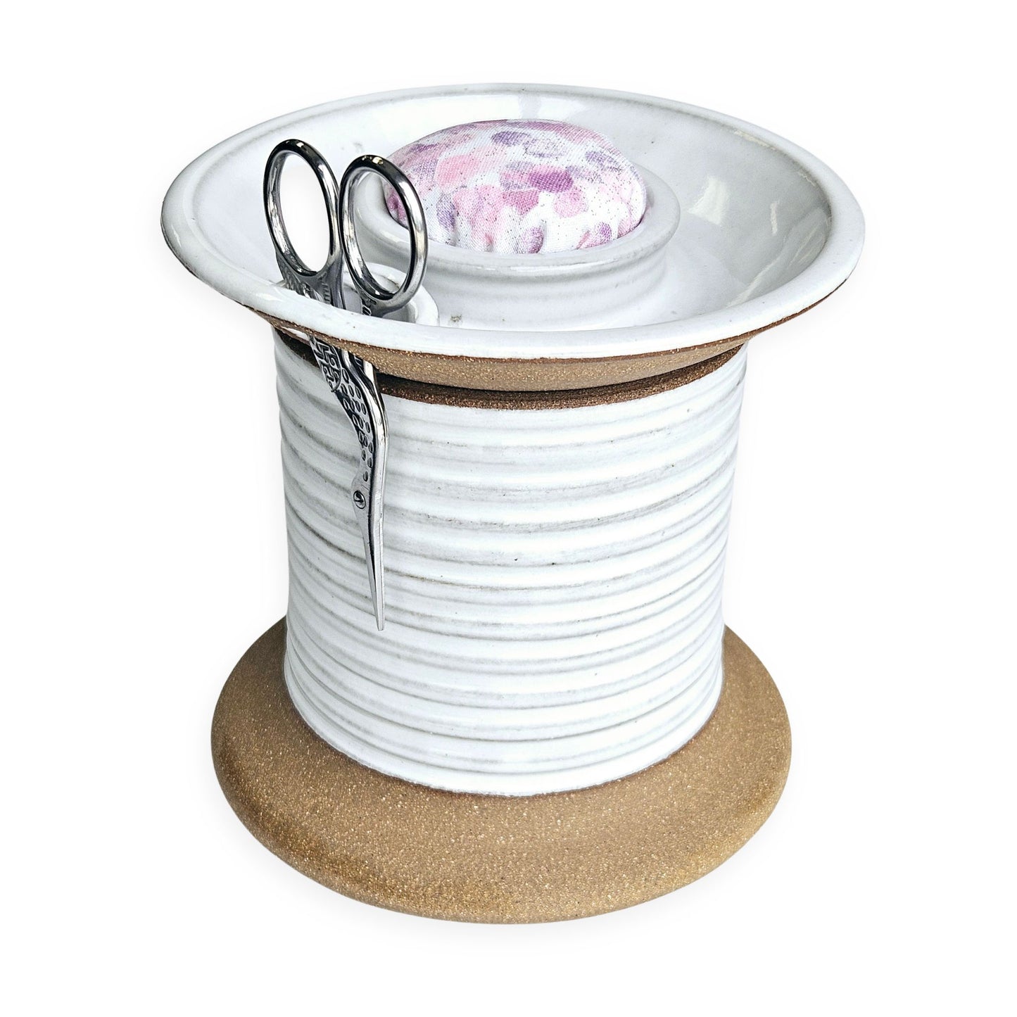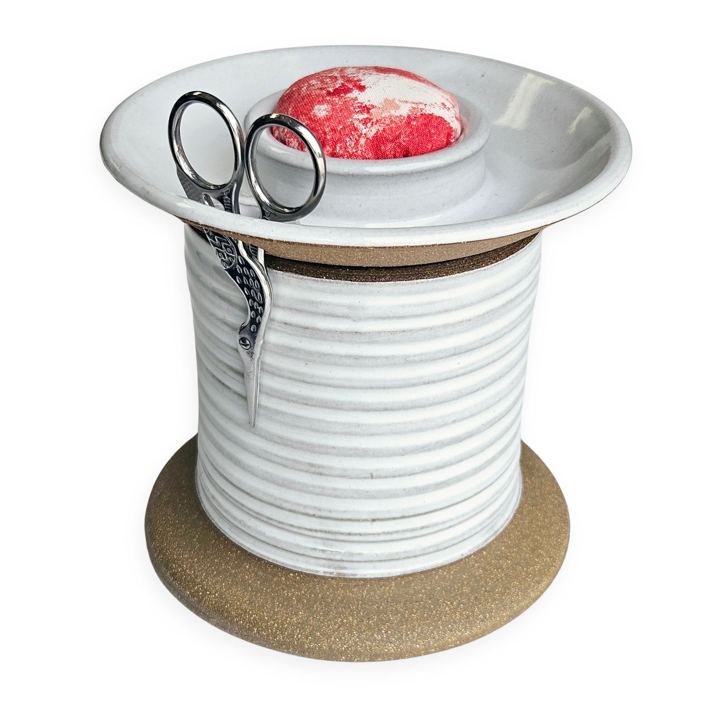 Modeled after an oversized spool of thread, this sewing caddy is your go-to station to house all of your essential implements in one convenient place. Unique gift for sewers of all abilities, novice to experienced. It is a delightful and practical addition to any sewing or crafting room. It is easily portable to your end table for some evening mending, and left out for display, it is a conversation piece. The removable lid is complete with a slot for holding scissors, bobbin storage, and it is topped with a fabric covered pincushion. The inner compartment acts as additional storage. Handmade on the potter's wheel, finished in handcrafted ceramic glazes and kiln fired.
