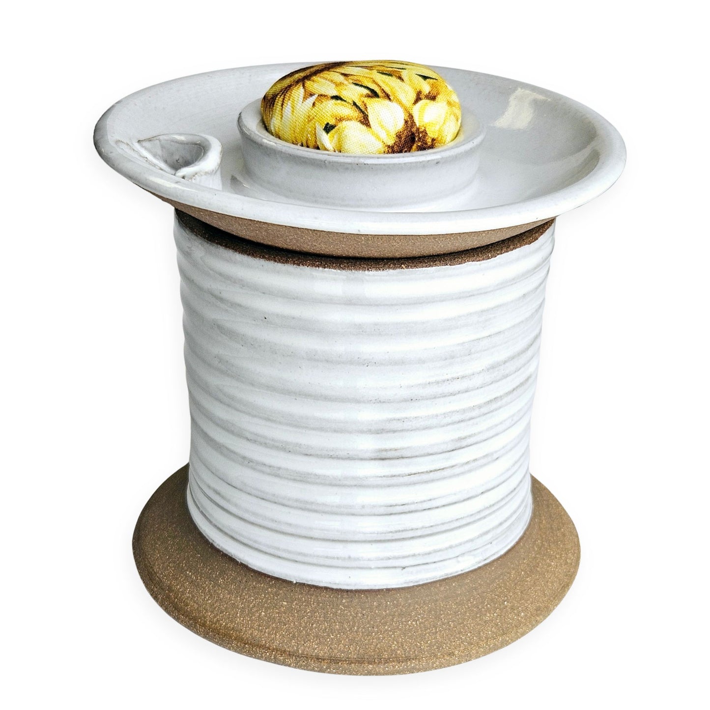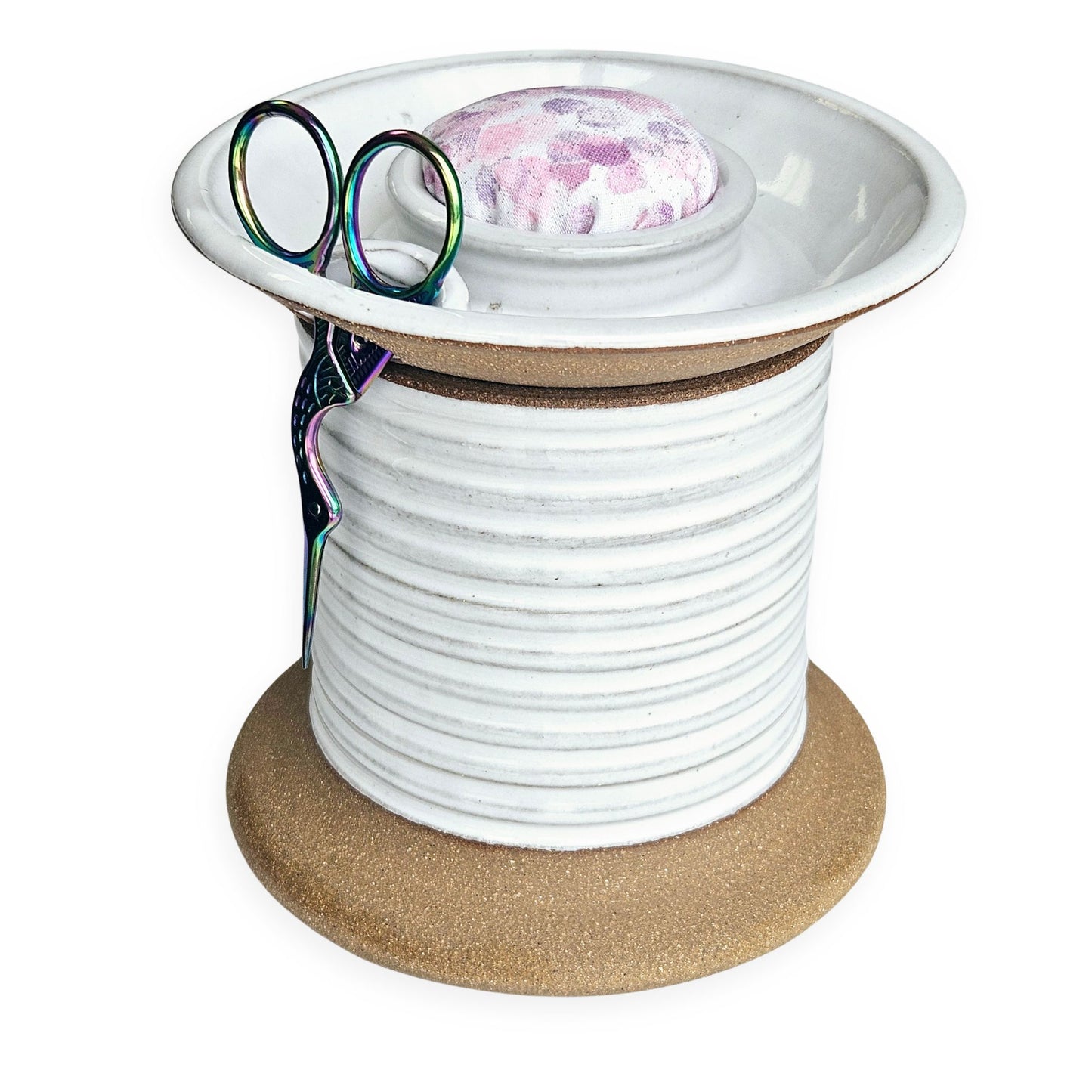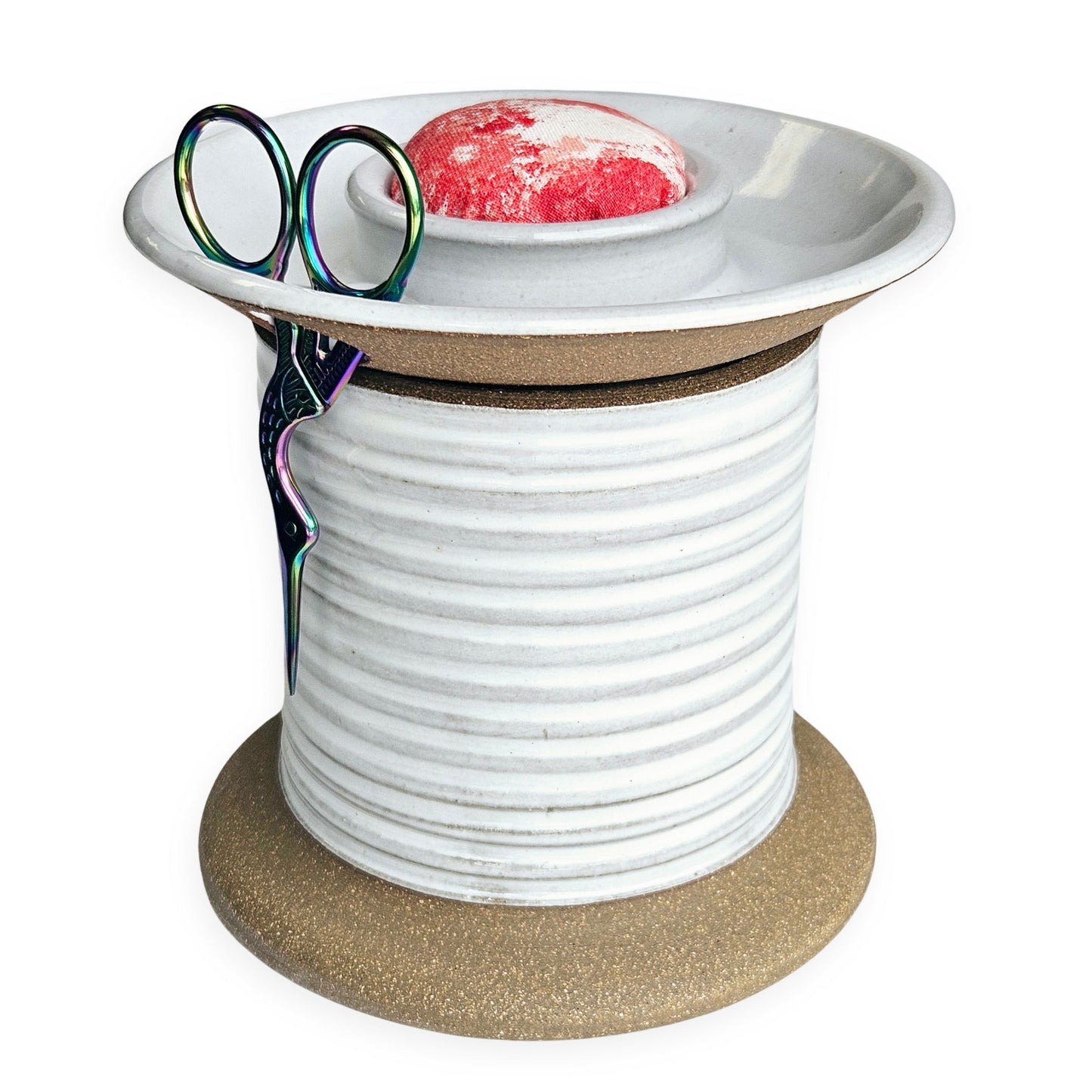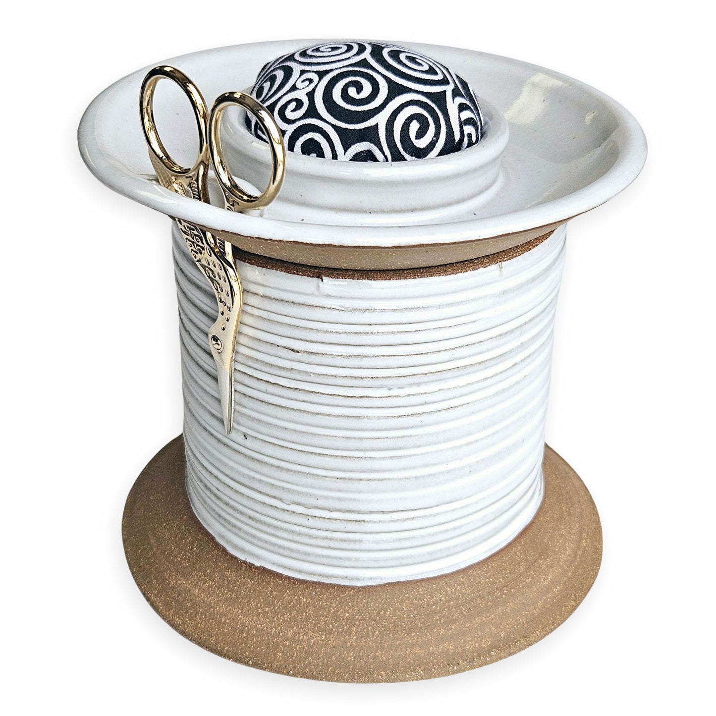 Modeled after an oversized spool of thread, this sewing caddy is your go-to station to house all of your essential implements in one convenient place. Unique gift for sewers of all abilities, novice to experienced. It is a delightful and practical addition to any sewing or crafting room. It is easily portable to your end table for some evening mending, and left out for display, it is a conversation piece. The removable lid is complete with a slot for holding scissors, bobbin storage, and it is topped with a fabric covered pincushion. The inner compartment acts as additional storage. Handmade on the potter's wheel, finished in handcrafted ceramic glazes and kiln fired.