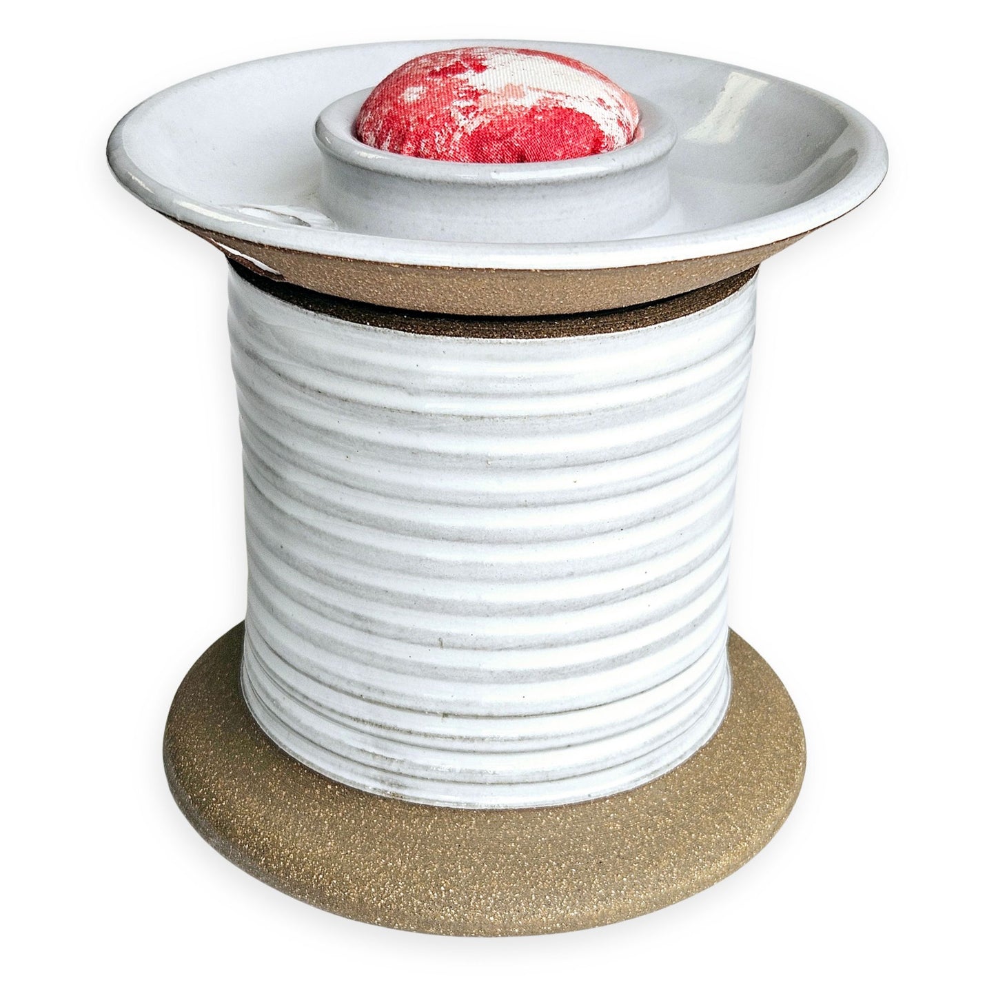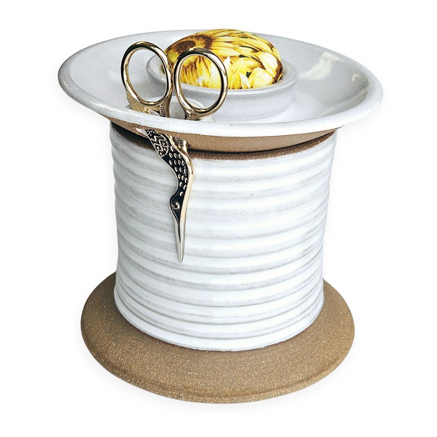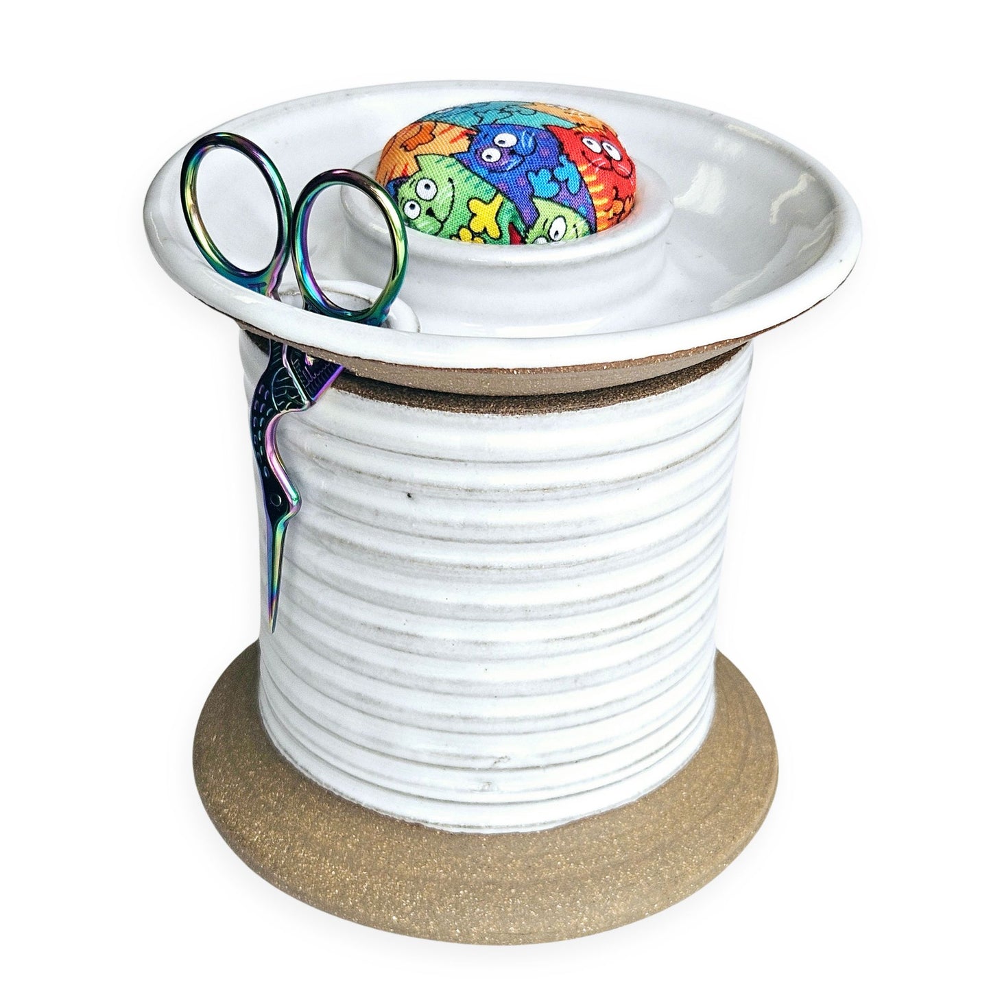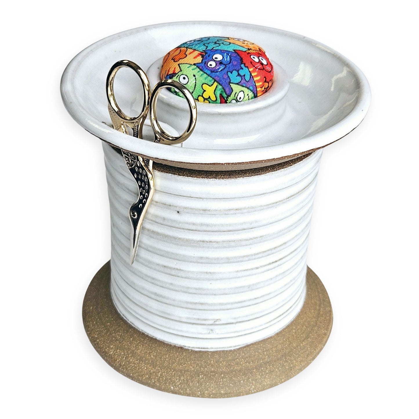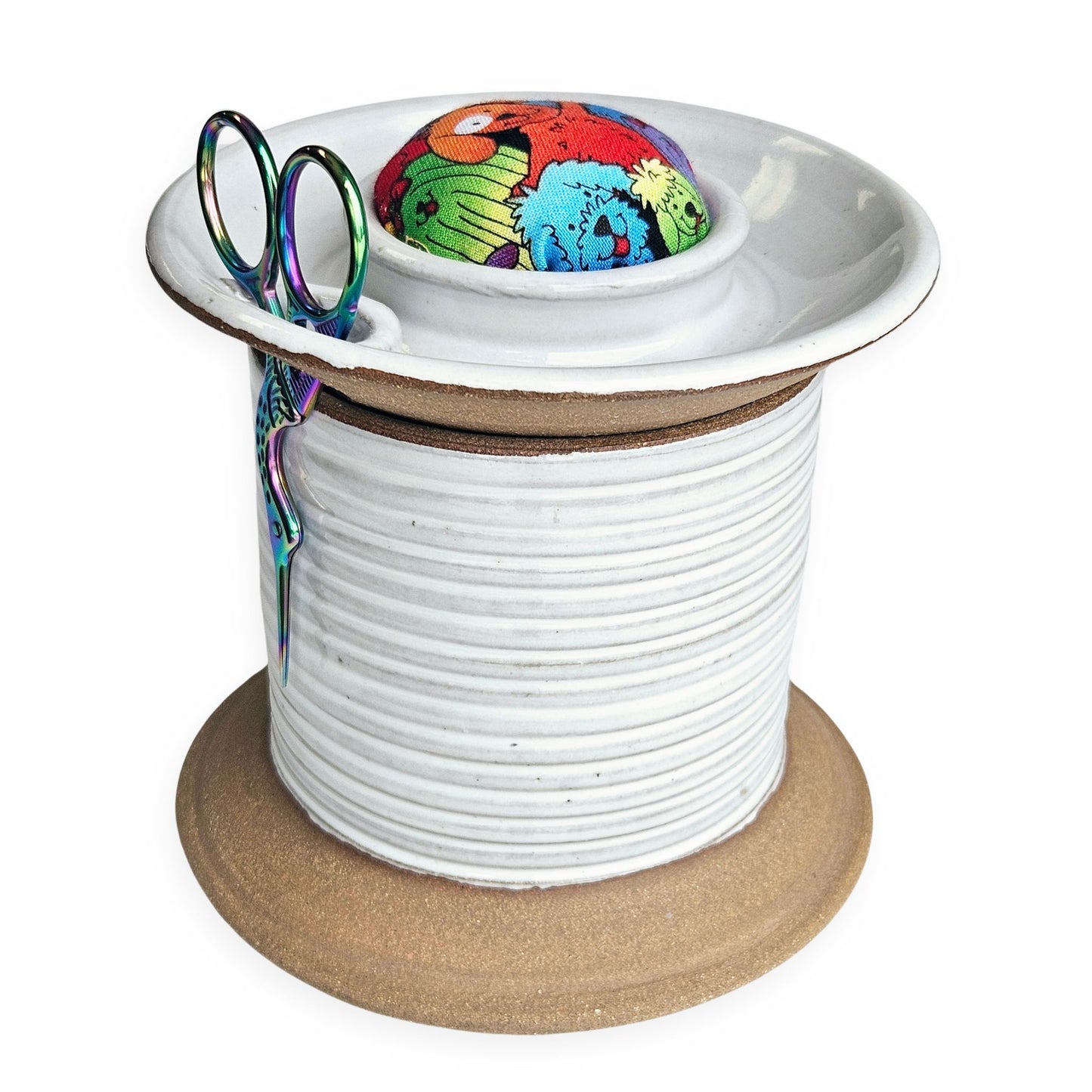 Modeled after an oversized spool of thread, this sewing caddy is your go-to station to house all of your essential implements in one convenient place. Unique gift for sewers of all abilities, novice to experienced. It is a delightful and practical addition to any sewing or crafting room. It is easily portable to your end table for some evening mending, and left out for display, it is a conversation piece. The removable lid is complete with a slot for holding scissors, bobbin storage, and it is topped with a fabric covered pincushion. The inner compartment acts as additional storage. Handmade on the potter's wheel, finished in handcrafted ceramic glazes and kiln fired.
