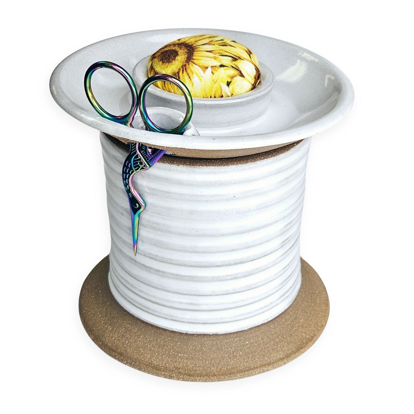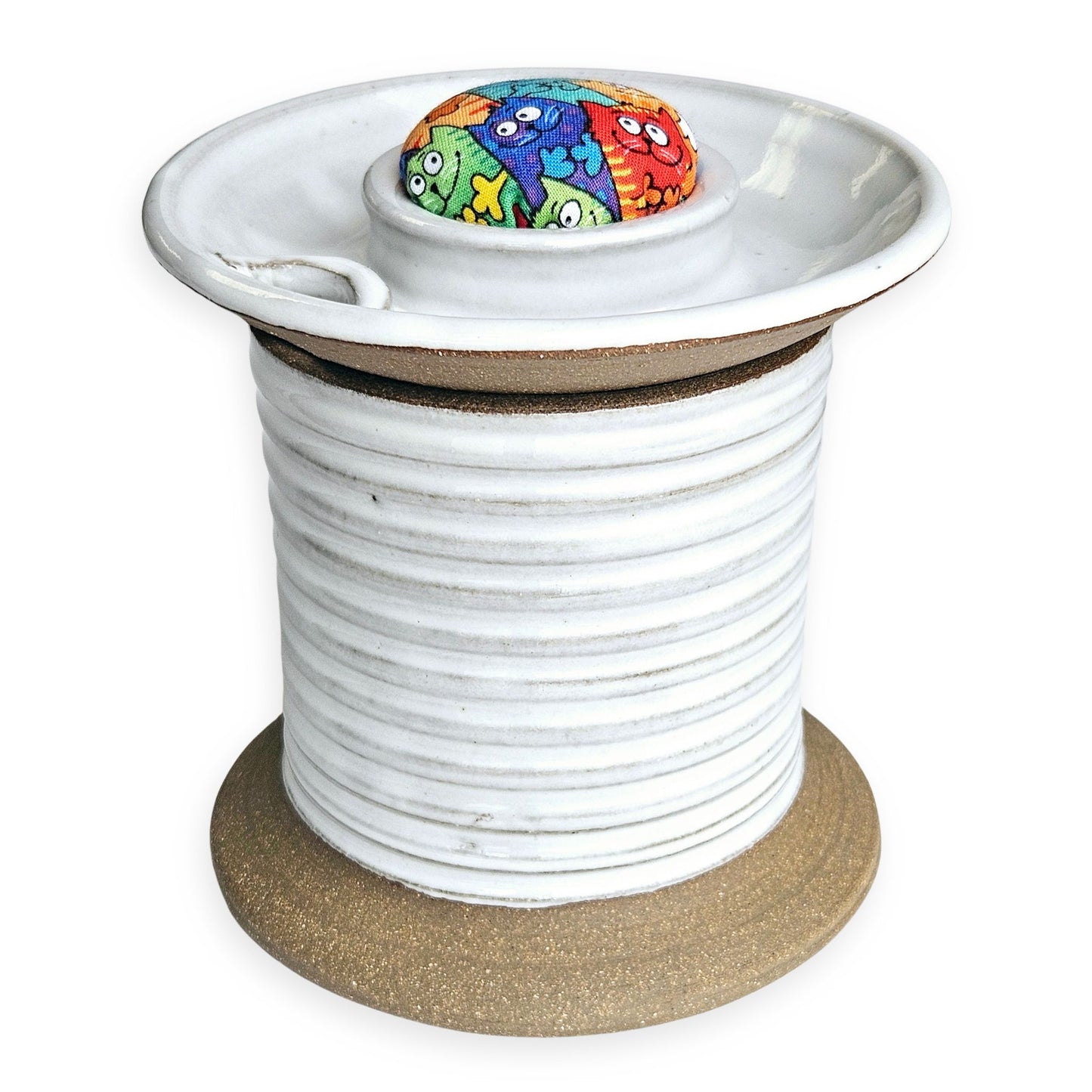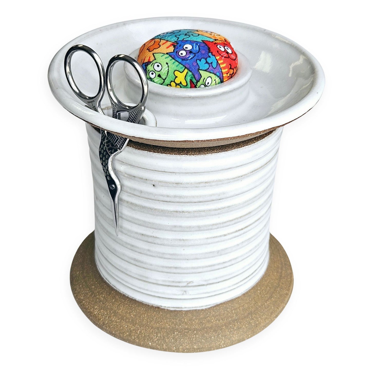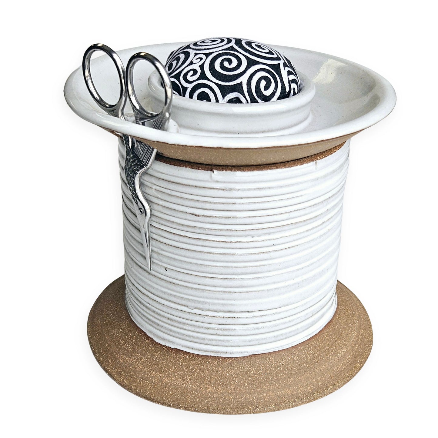 Modeled after an oversized spool of thread, this sewing caddy is your go-to station to house all of your essential implements in one convenient place. Unique gift for sewers of all abilities, novice to experienced. It is a delightful and practical addition to any sewing or crafting room. It is easily portable to your end table for some evening mending, and left out for display, it is a conversation piece. The removable lid is complete with a slot for holding scissors, bobbin storage, and it is topped with a fabric covered pincushion. The inner compartment acts as additional storage. Handmade on the potter's wheel, finished in handcrafted ceramic glazes and kiln fired.