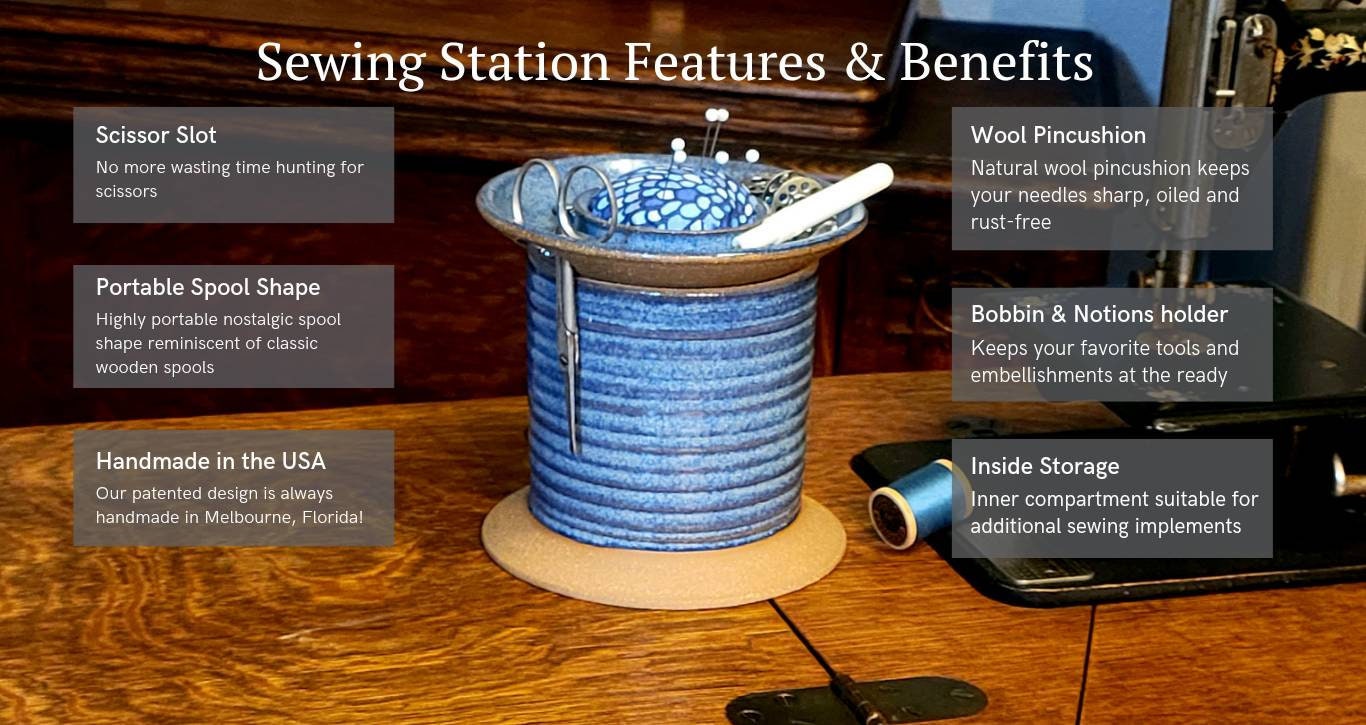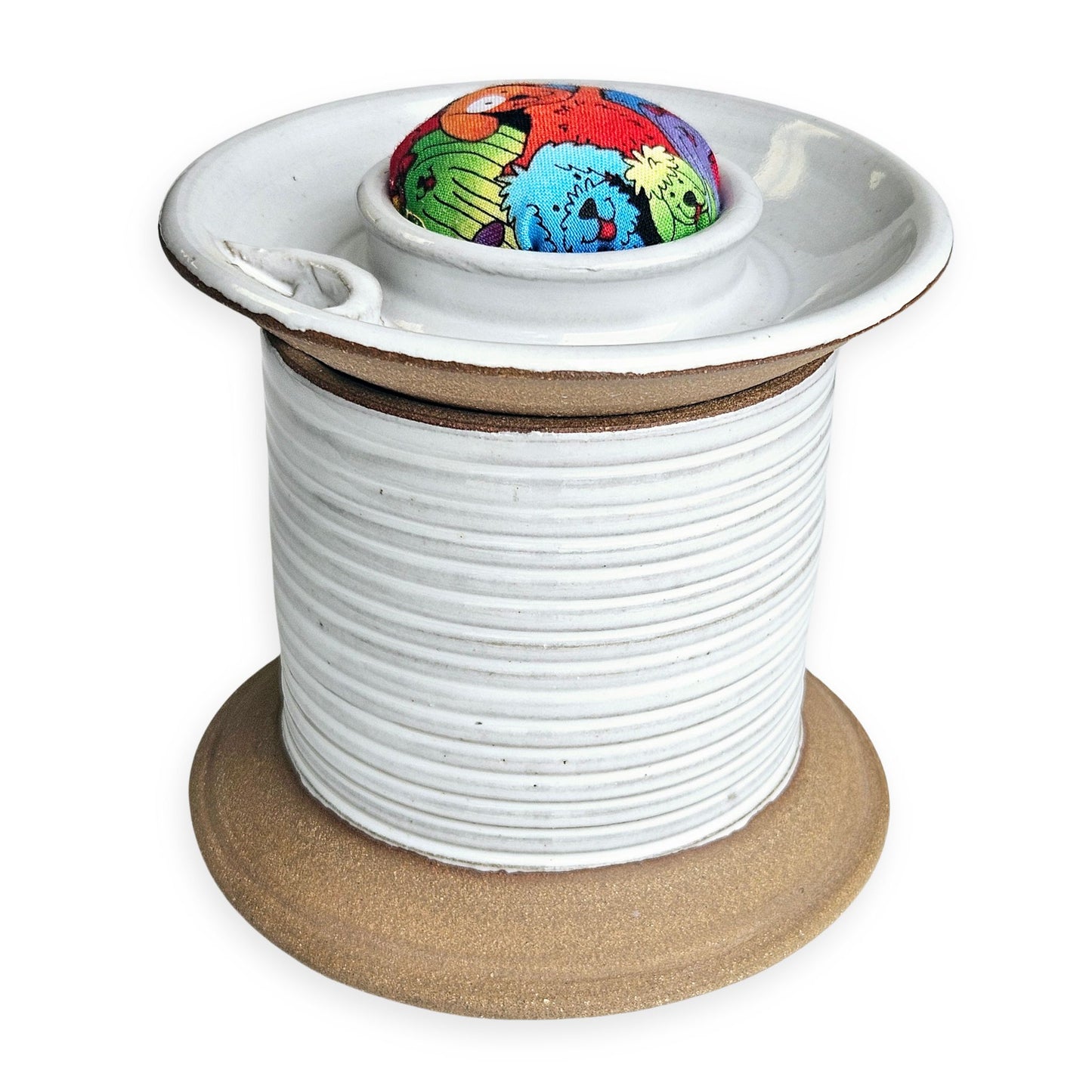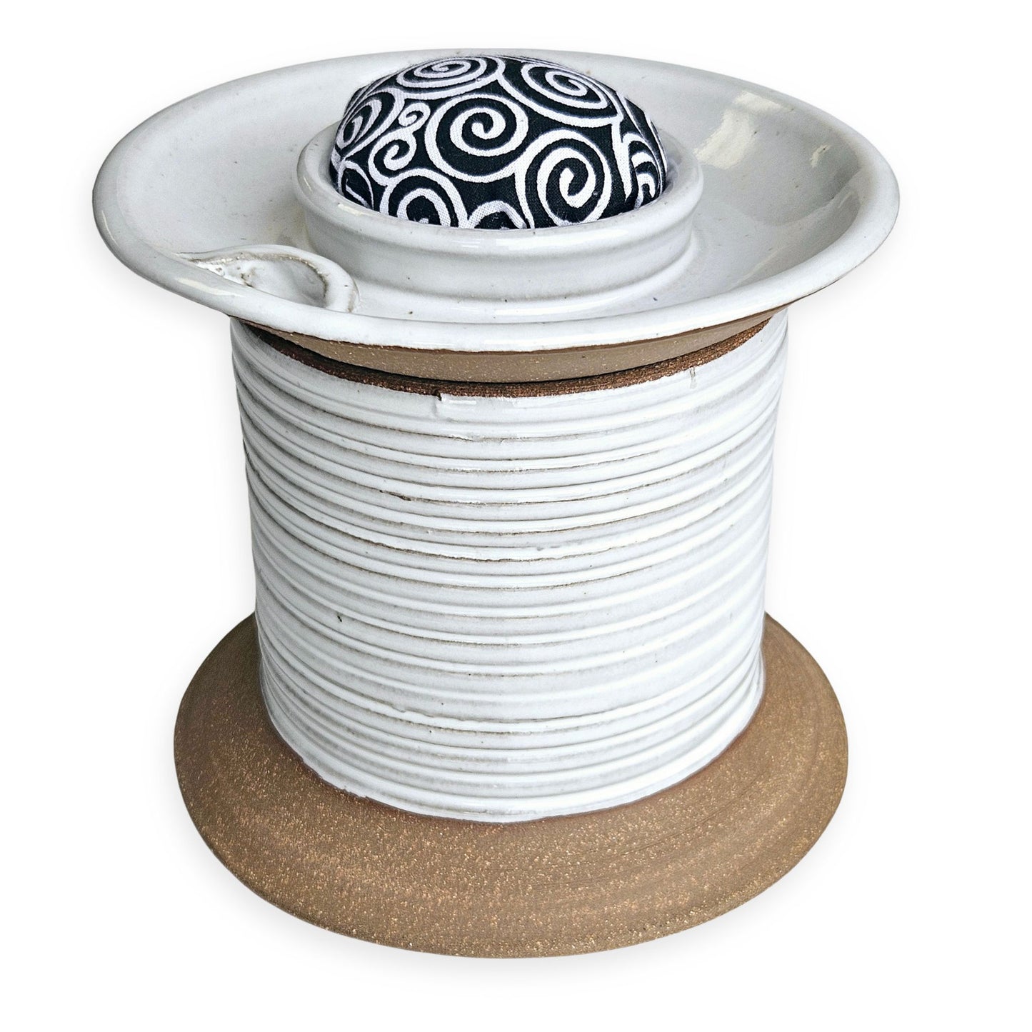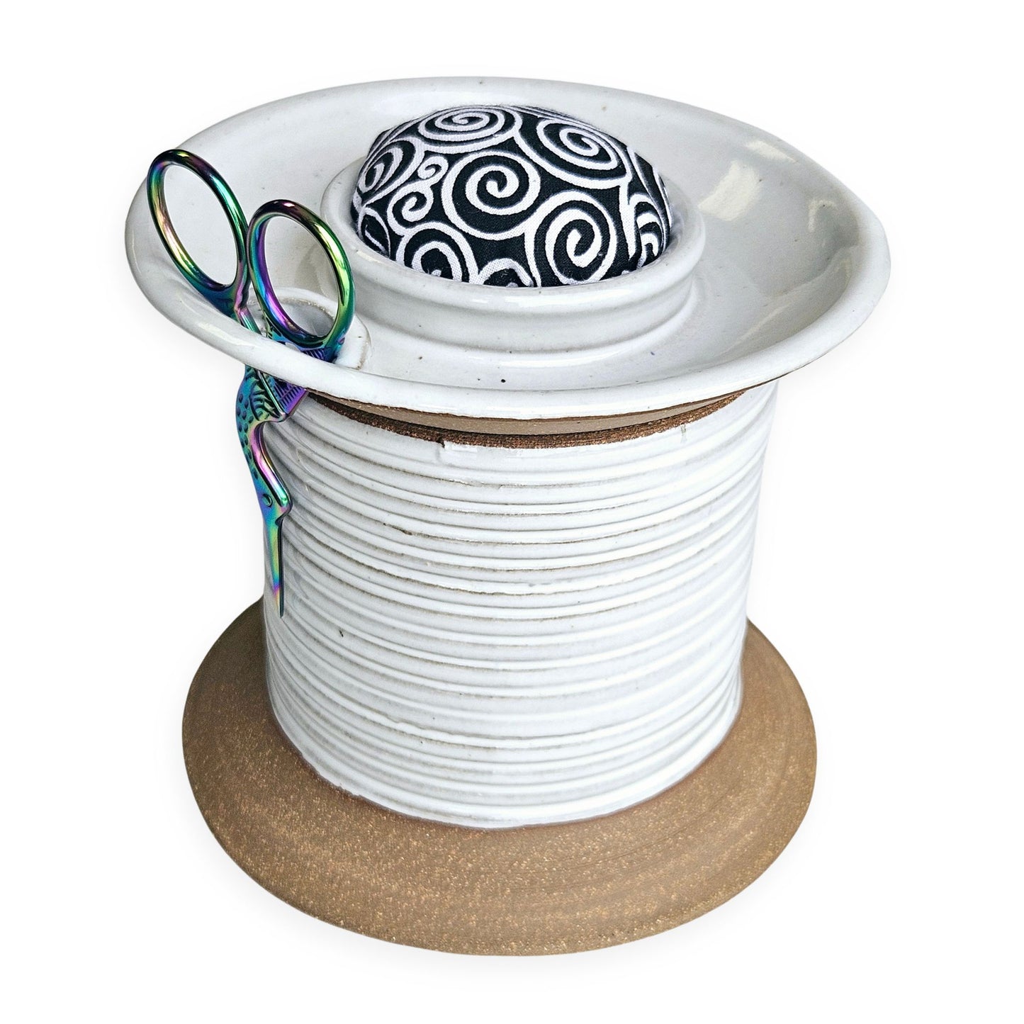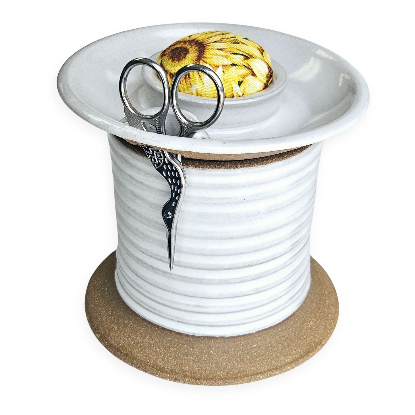 Modeled after an oversized spool of thread, this sewing caddy is your go-to station to house all of your essential implements in one convenient place. Unique gift for sewers of all abilities, novice to experienced. It is a delightful and practical addition to any sewing or crafting room. It is easily portable to your end table for some evening mending, and left out for display, it is a conversation piece. The removable lid is complete with a slot for holding scissors, bobbin storage, and it is topped with a fabric covered pincushion. The inner compartment acts as additional storage. Handmade on the potter's wheel, finished in handcrafted ceramic glazes and kiln fired.