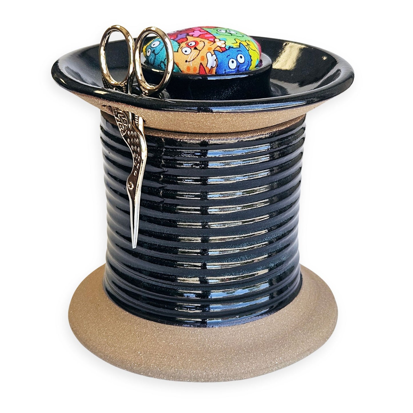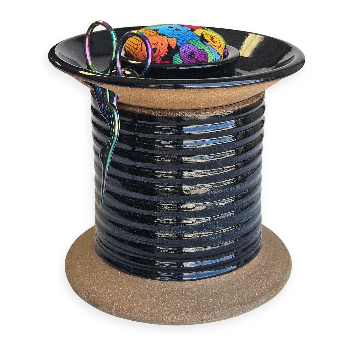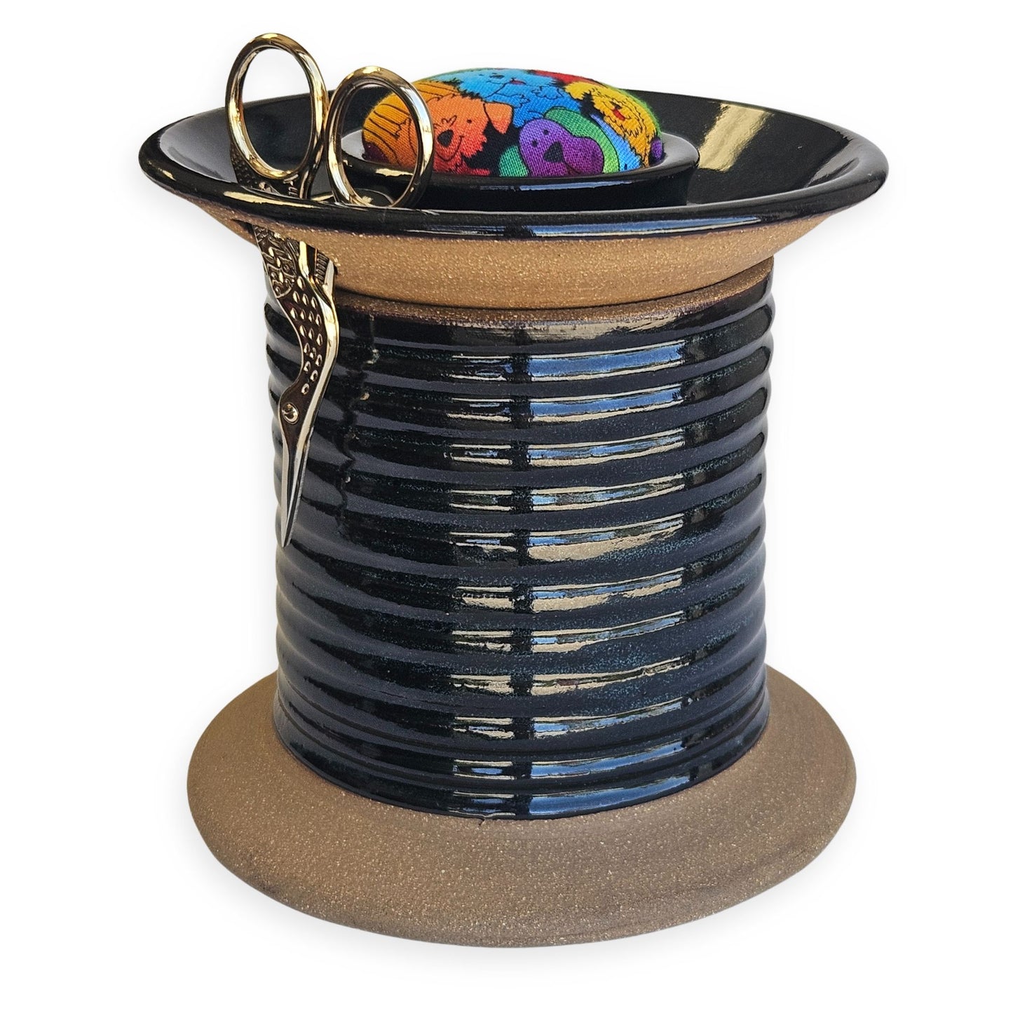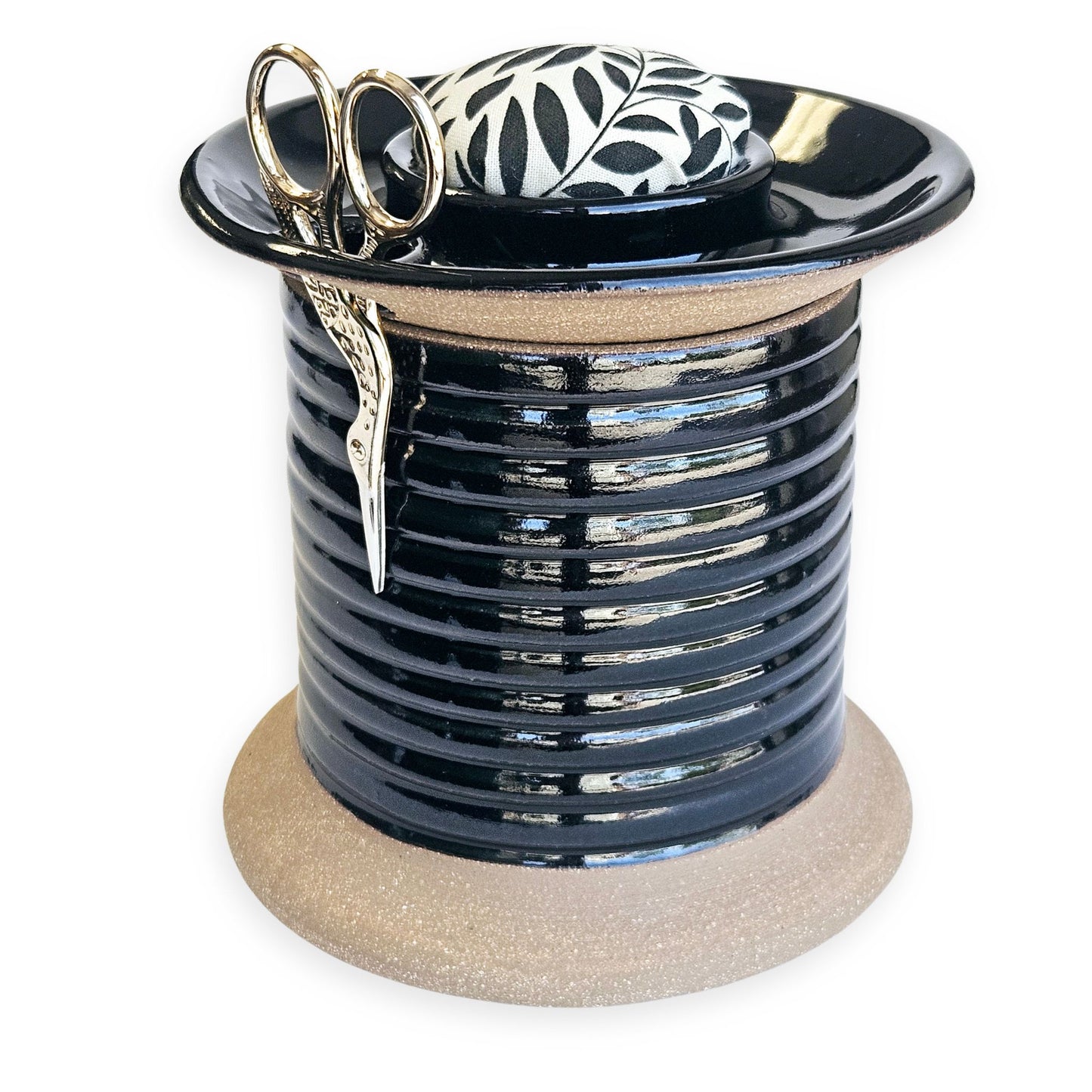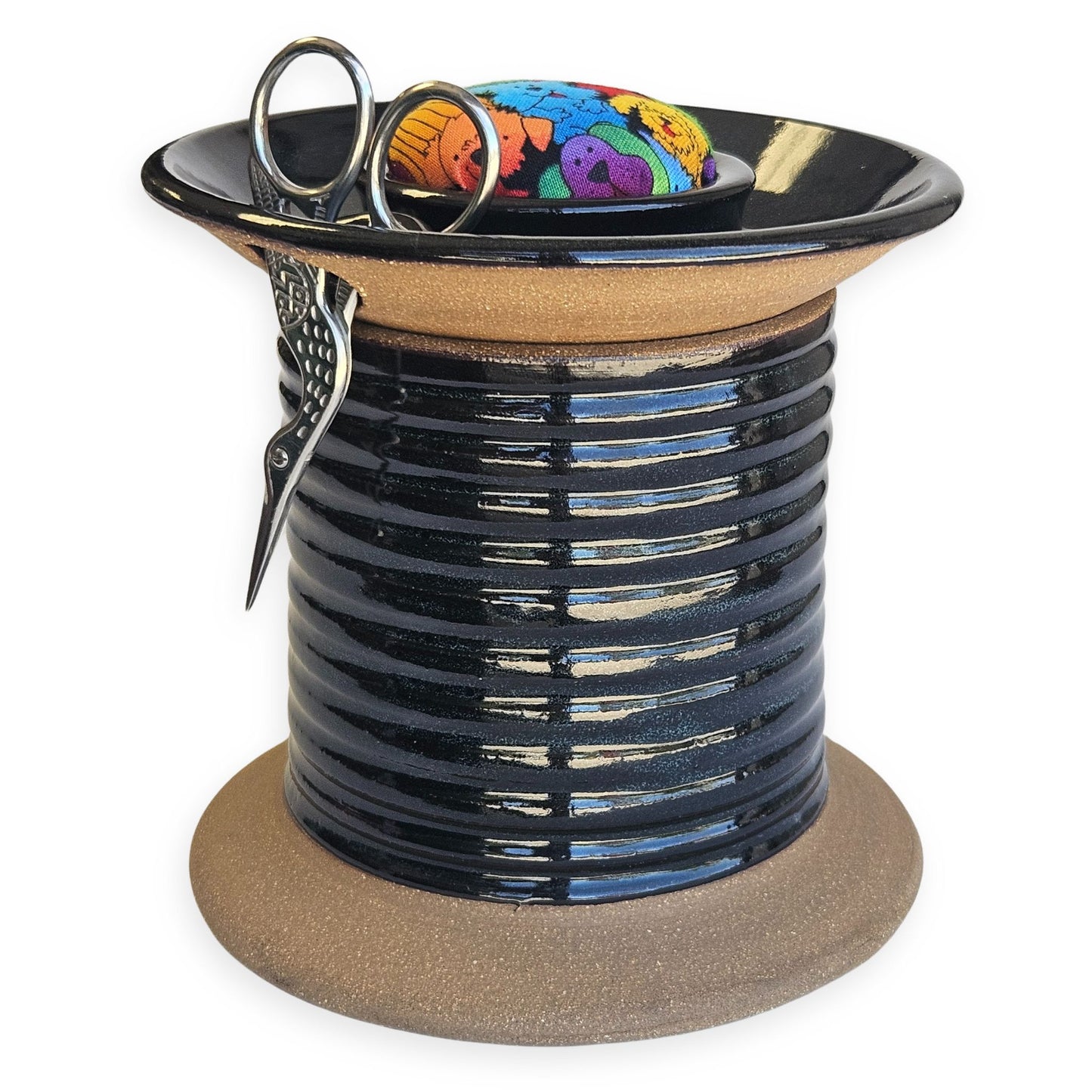 Modeled after an oversized spool of thread, this sewing caddy is your go-to station to house all of your essential implements in one convenient place. Unique gift for sewers of all abilities, novice to experienced. It is a delightful and practical addition to any sewing or crafting room. It is easily portable to your end table for some evening mending, and left out for display, it is a conversation piece. The removable lid is complete with a slot for holding scissors, bobbin storage, and it is topped with a fabric covered pincushion. The inner compartment acts as additional storage. Handmade on the potter's wheel, finished in handcrafted ceramic glazes and kiln fired.