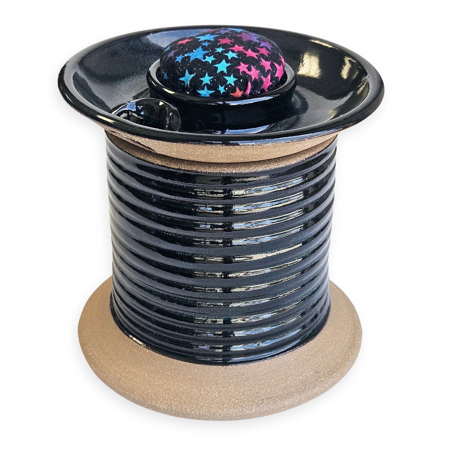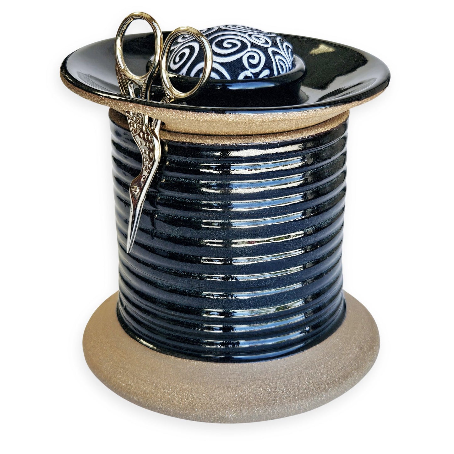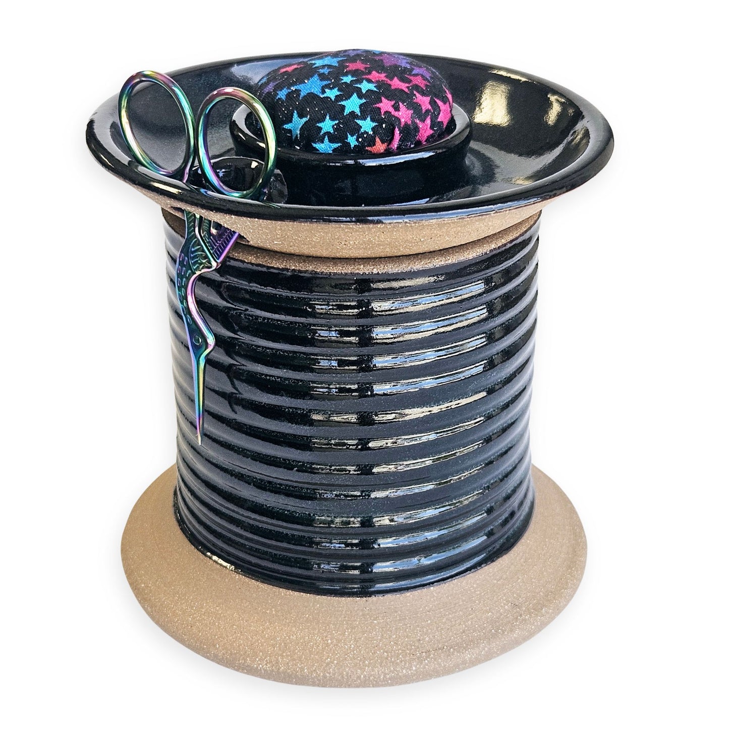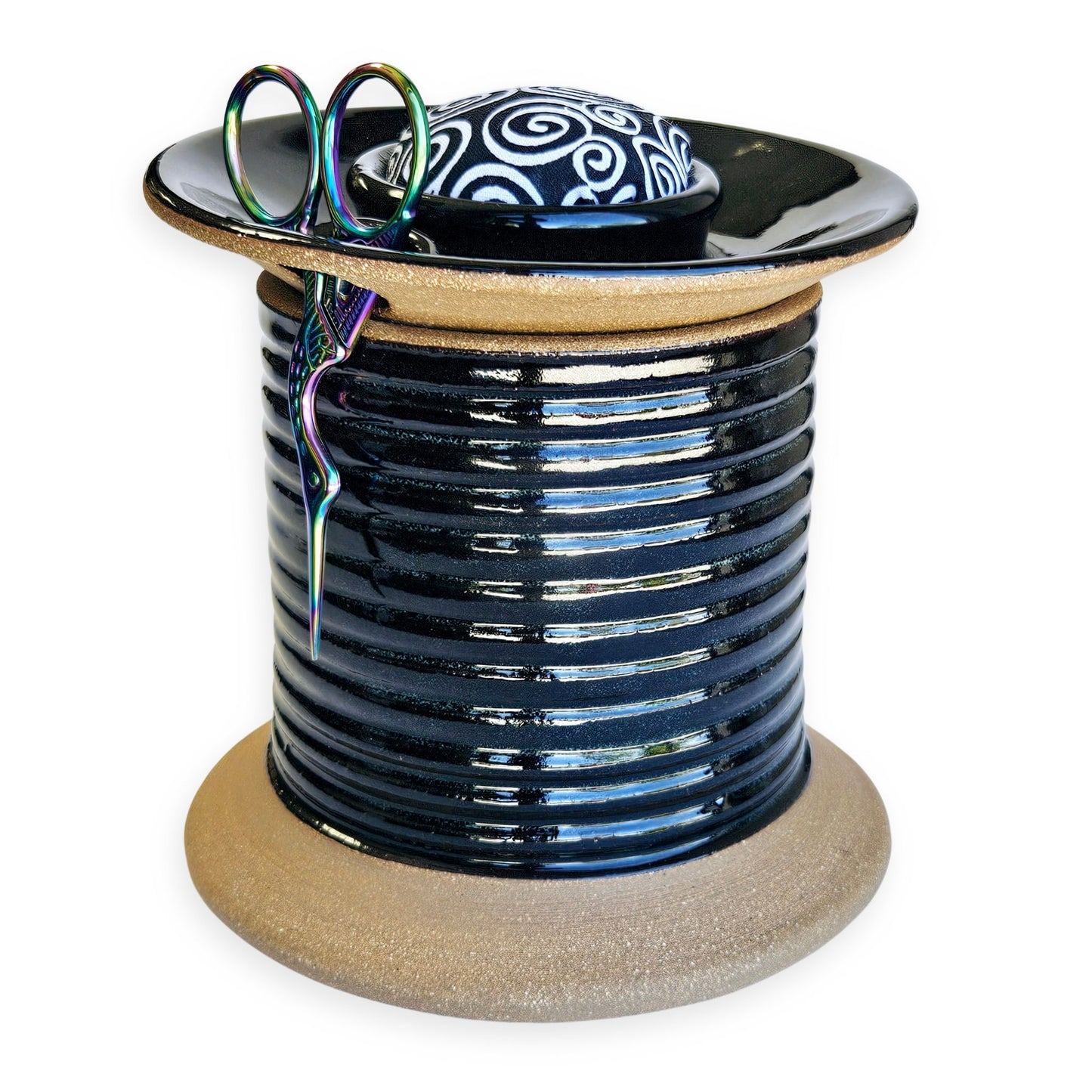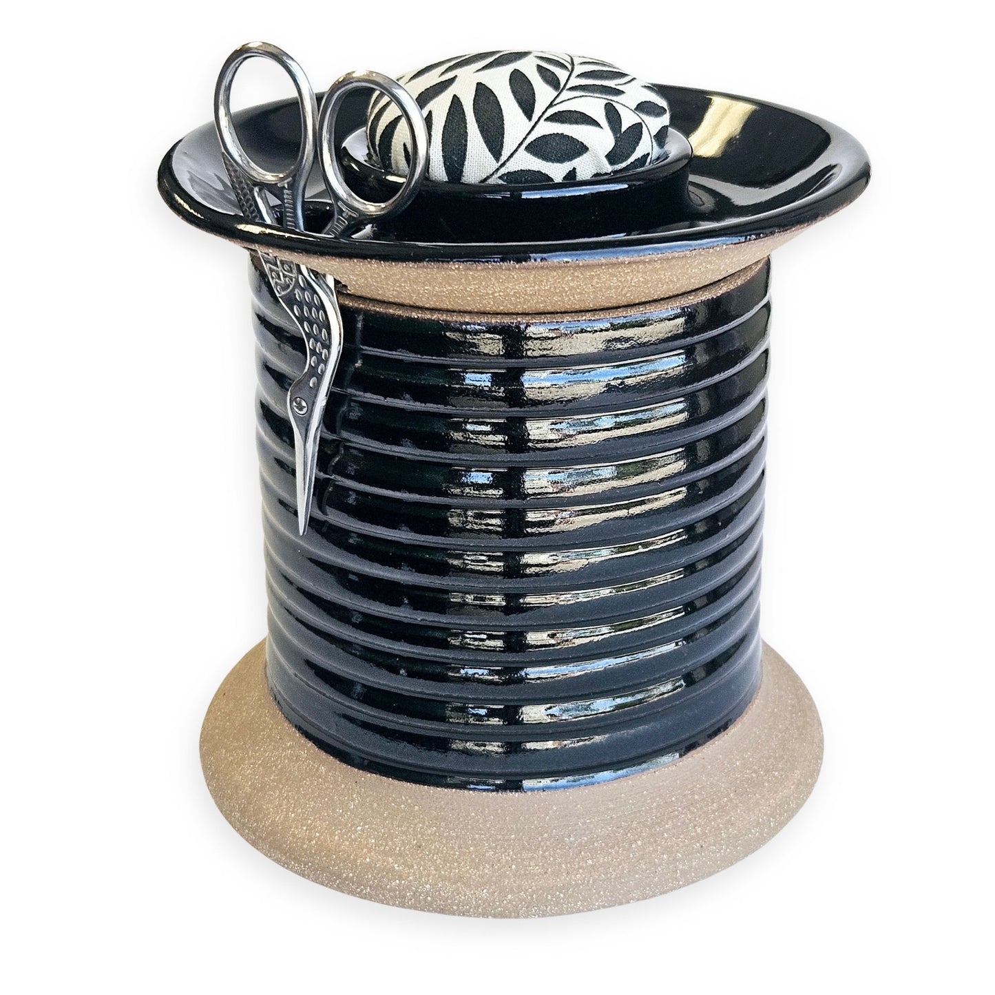 Modeled after an oversized spool of thread, this sewing caddy is your go-to station to house all of your essential implements in one convenient place. Unique gift for sewers of all abilities, novice to experienced. It is a delightful and practical addition to any sewing or crafting room. It is easily portable to your end table for some evening mending, and left out for display, it is a conversation piece. The removable lid is complete with a slot for holding scissors, bobbin storage, and it is topped with a fabric covered pincushion. The inner compartment acts as additional storage. Handmade on the potter's wheel, finished in handcrafted ceramic glazes and kiln fired.