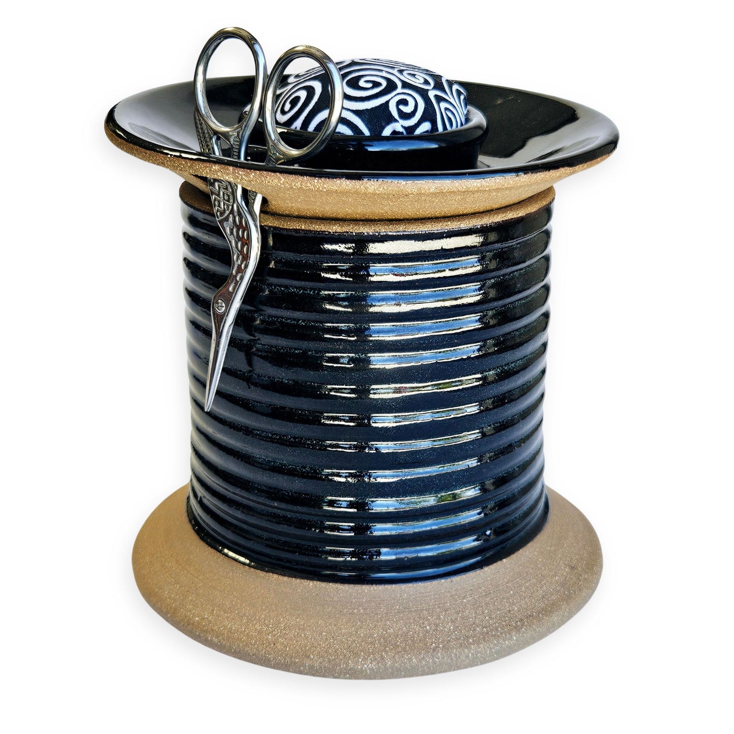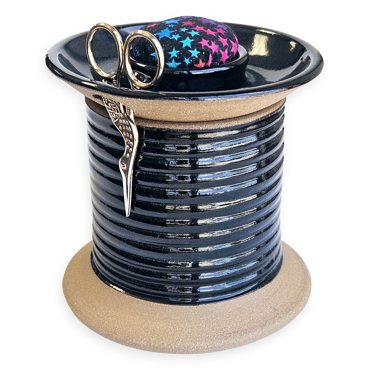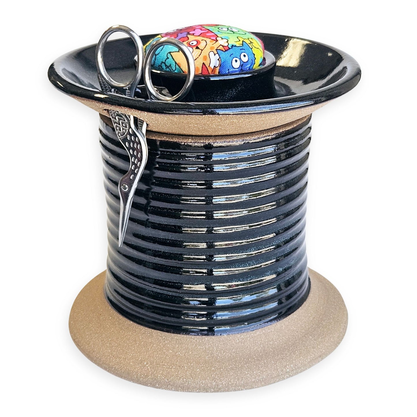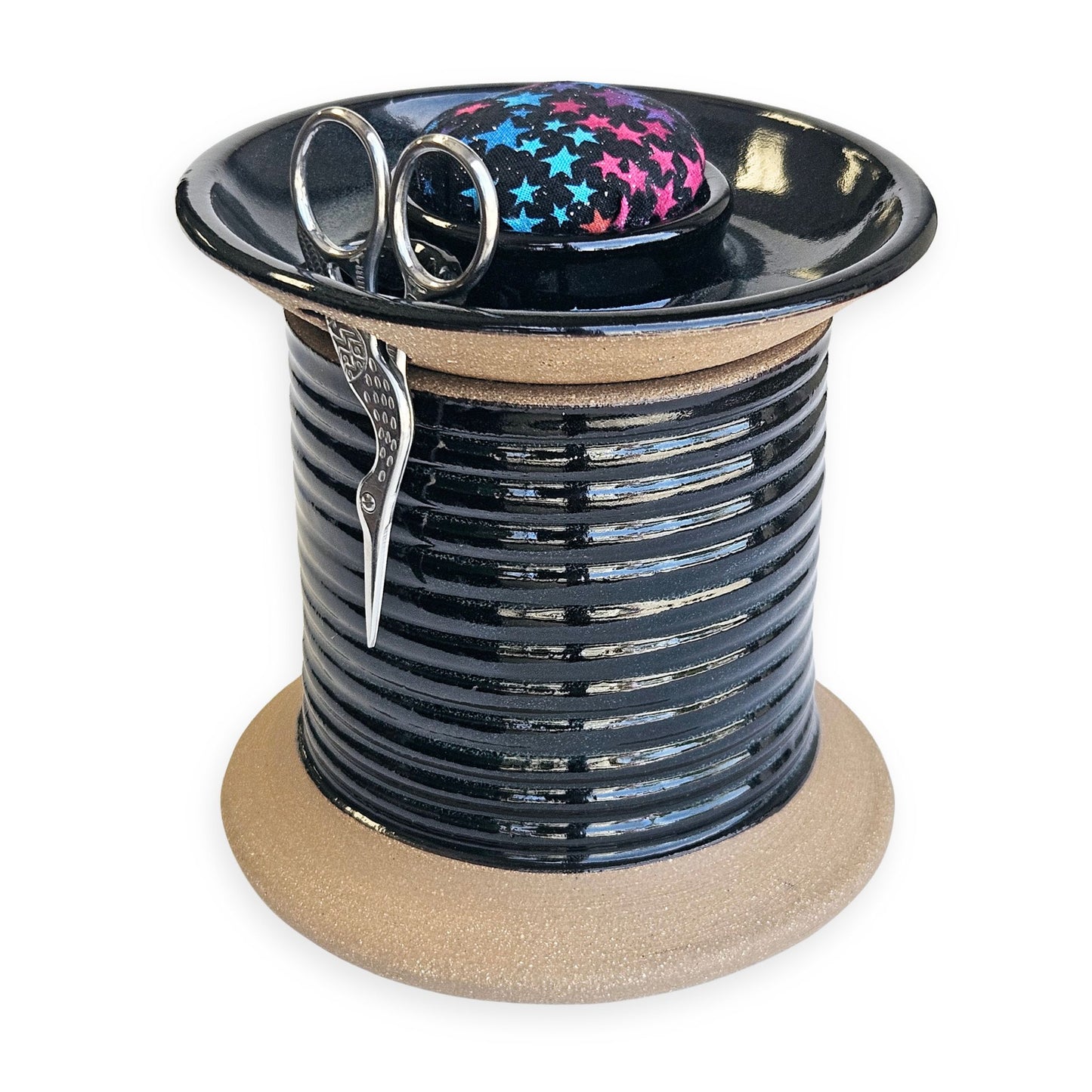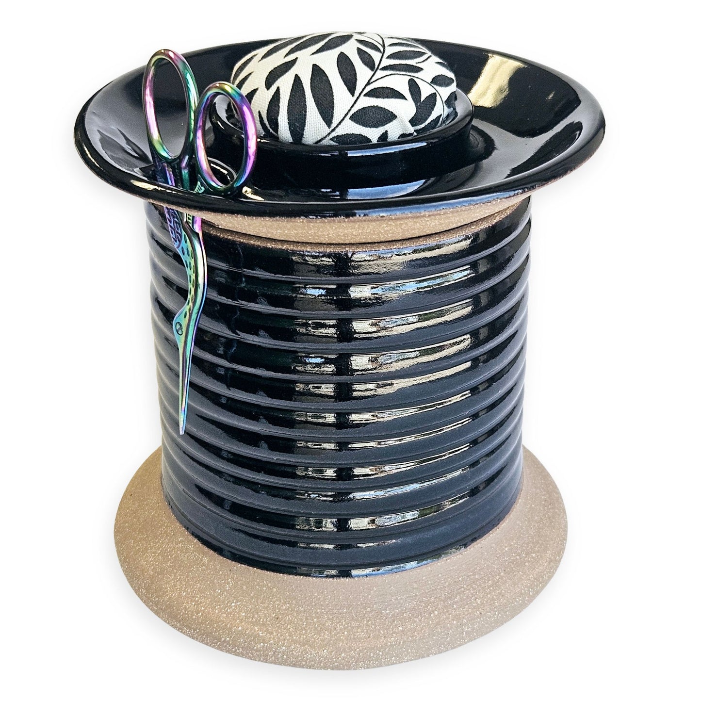 Modeled after an oversized spool of thread, this sewing caddy is your go-to station to house all of your essential implements in one convenient place. Unique gift for sewers of all abilities, novice to experienced. It is a delightful and practical addition to any sewing or crafting room. It is easily portable to your end table for some evening mending, and left out for display, it is a conversation piece. The removable lid is complete with a slot for holding scissors, bobbin storage, and it is topped with a fabric covered pincushion. The inner compartment acts as additional storage. Handmade on the potter's wheel, finished in handcrafted ceramic glazes and kiln fired.