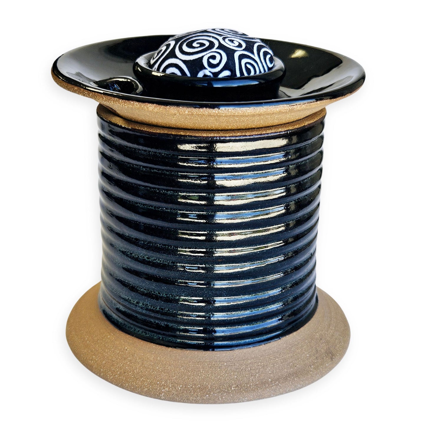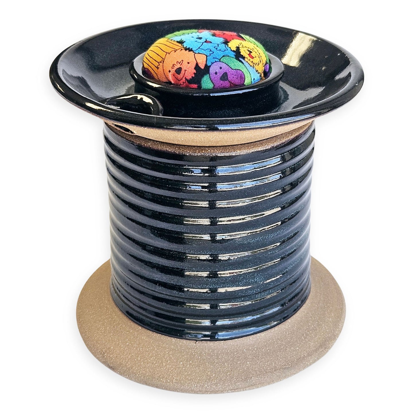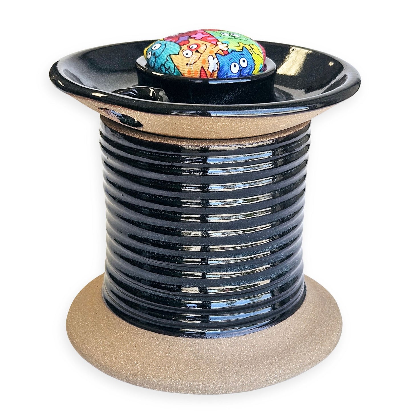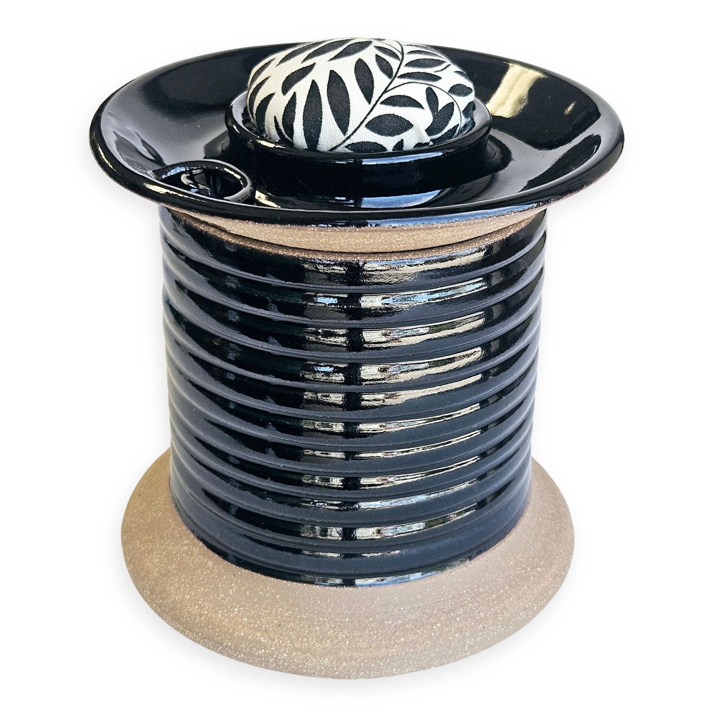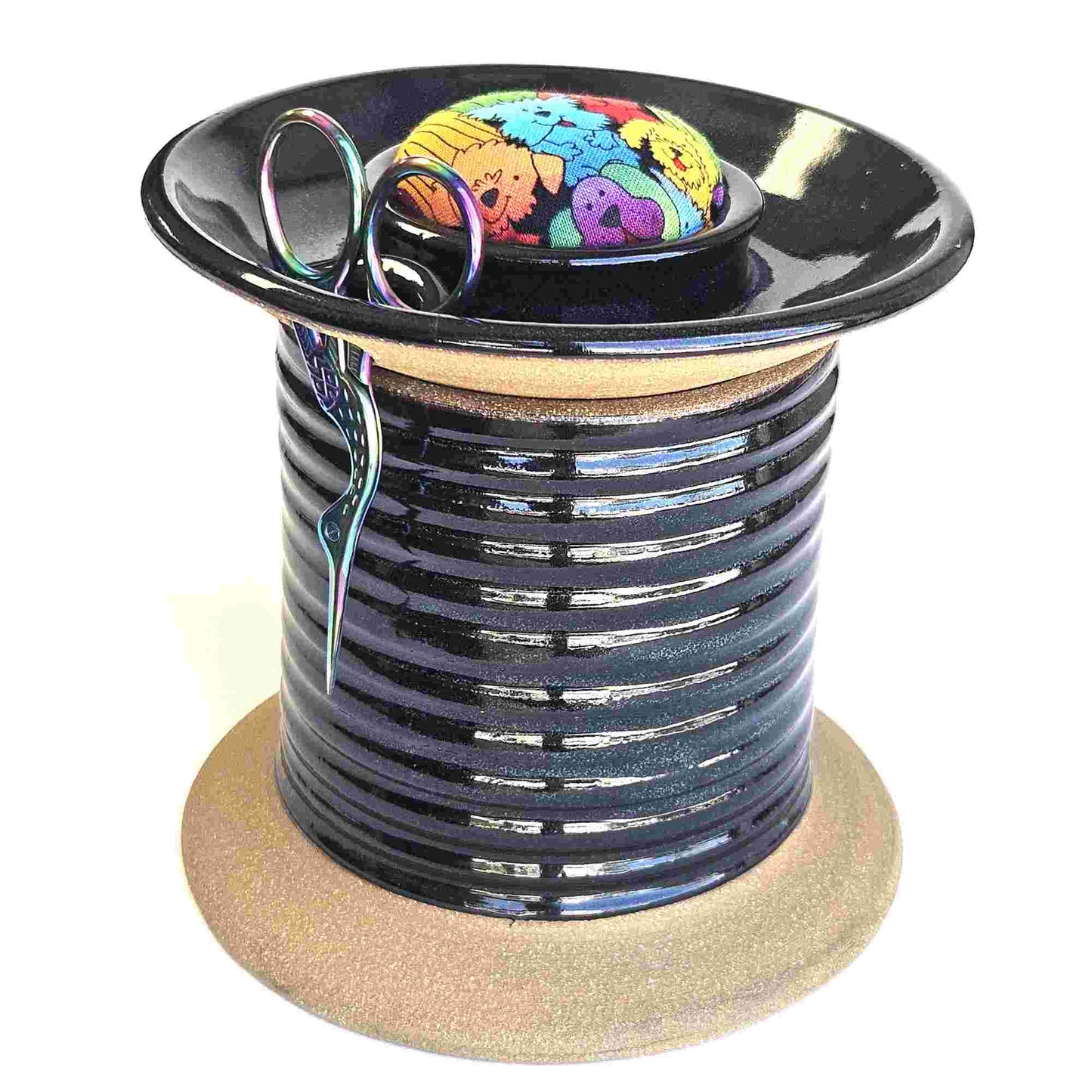 Modeled after an oversized spool of thread, this sewing caddy is your go-to station to house all of your essential implements in one convenient place. Unique gift for sewers of all abilities, novice to experienced. It is a delightful and practical addition to any sewing or crafting room. It is easily portable to your end table for some evening mending, and left out for display, it is a conversation piece. The removable lid is complete with a slot for holding scissors, bobbin storage, and it is topped with a fabric covered pincushion. The inner compartment acts as additional storage. Handmade on the potter's wheel, finished in handcrafted ceramic glazes and kiln fired.
