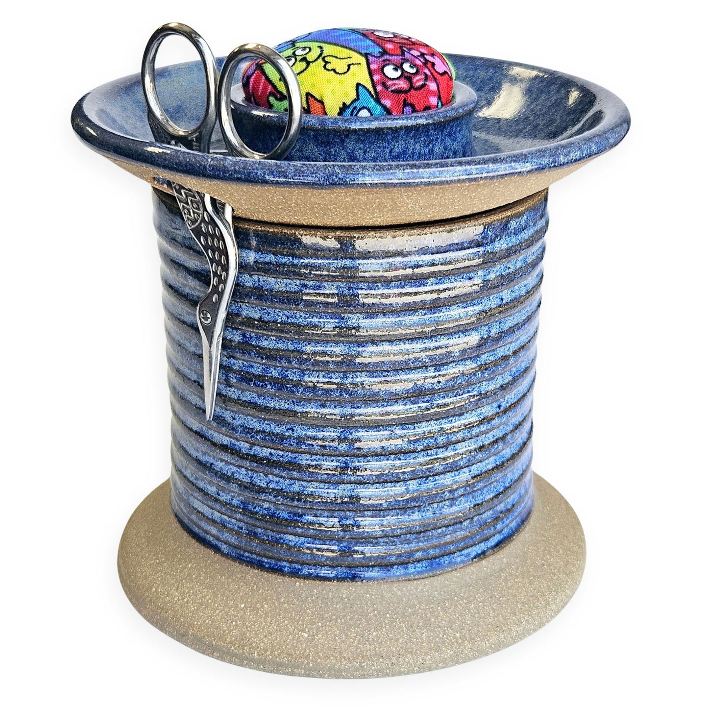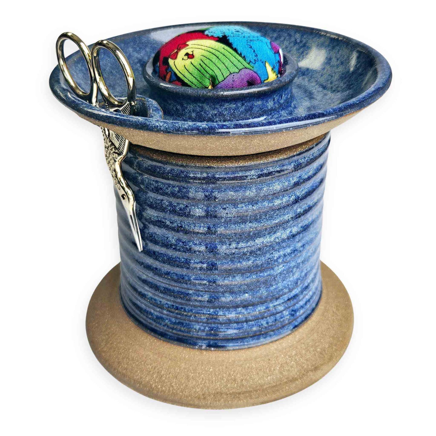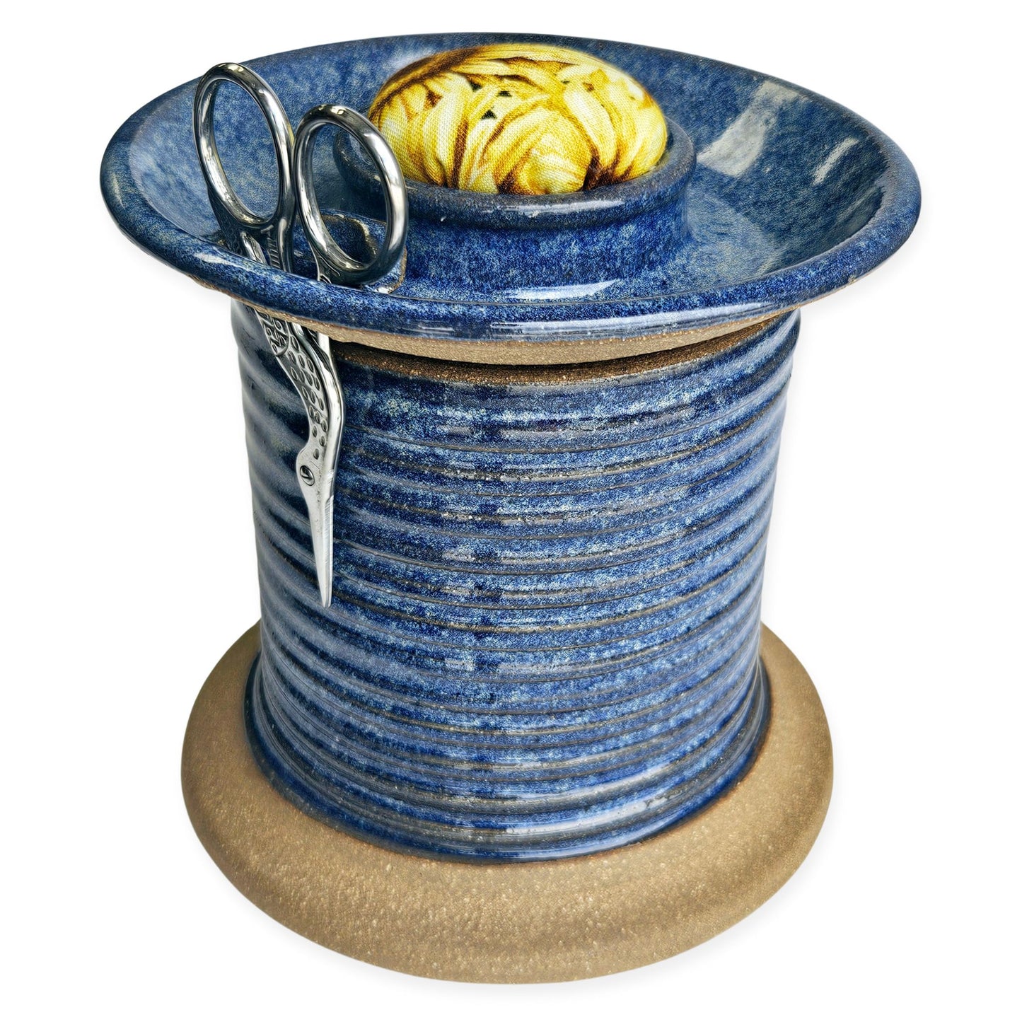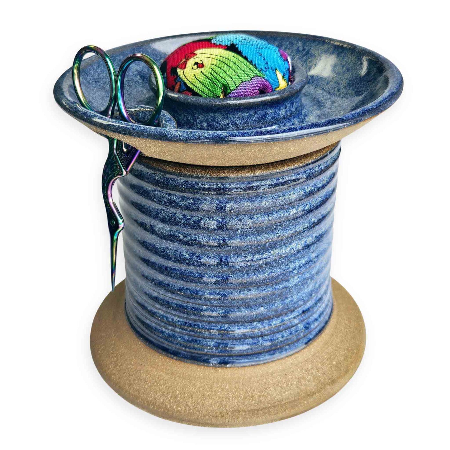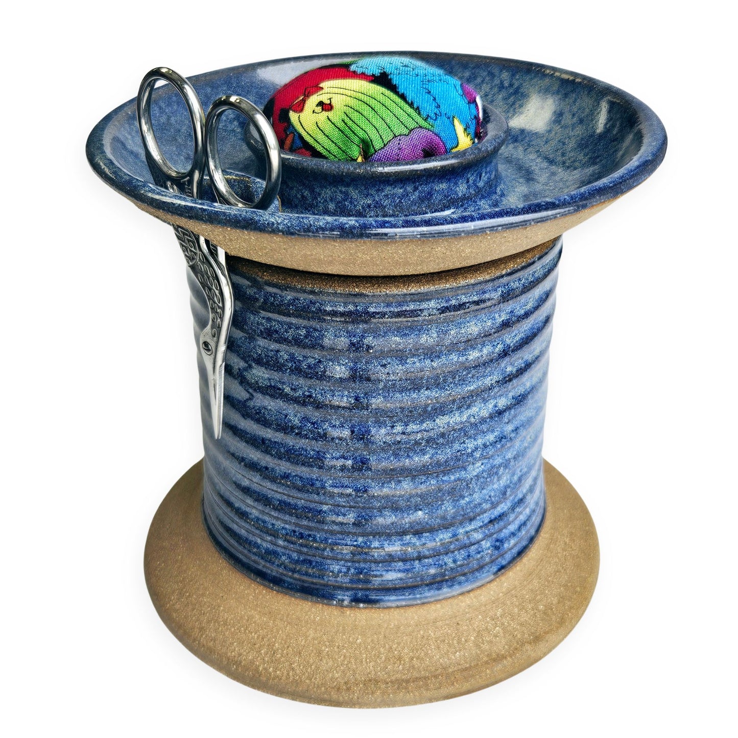 Get your hands on our Blue 'Sewing Station Caddy,' the ultimate sewing companion for everyone from tailoring professionals to occasional menders. Handmade with love and expertise, this oversized spool shaped caddy serves as an attractive and functional storage for sewing implements so you can stylishly keep your scissors, pins, tape measure, and other notions at hand. The artistic choice for those looking to gift something unique and purposeful to moms, grandmothers, sisters, friends, Ravelry buddies, fashion designers - anyone with a soft spot for sewing!