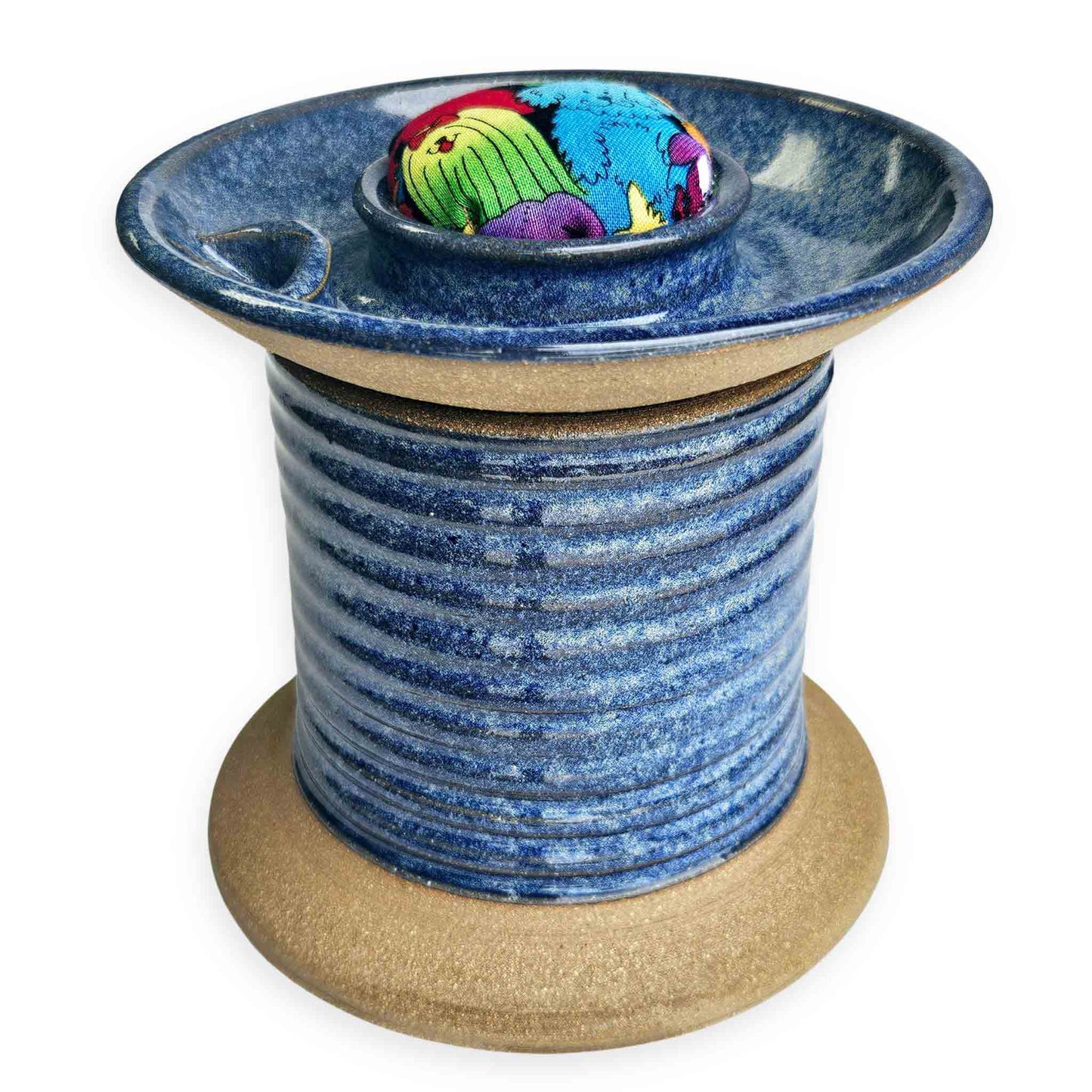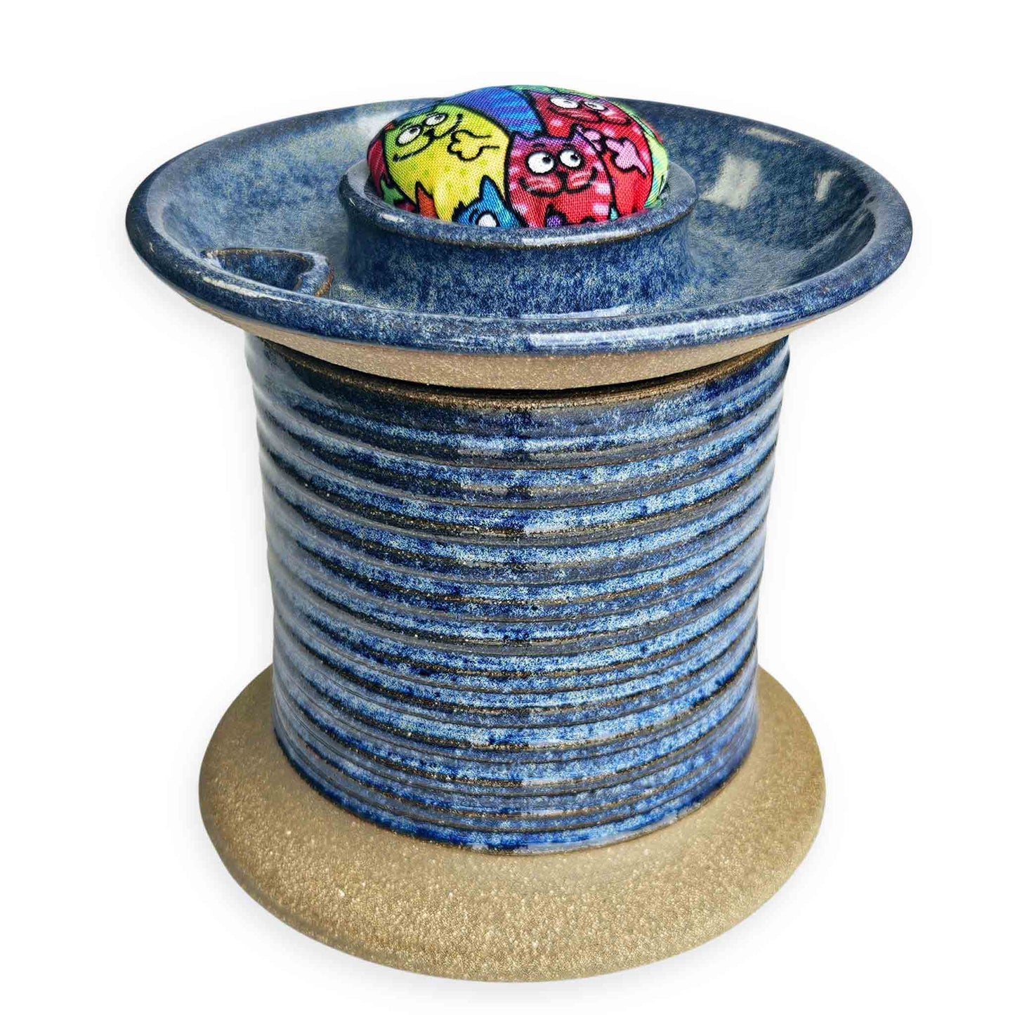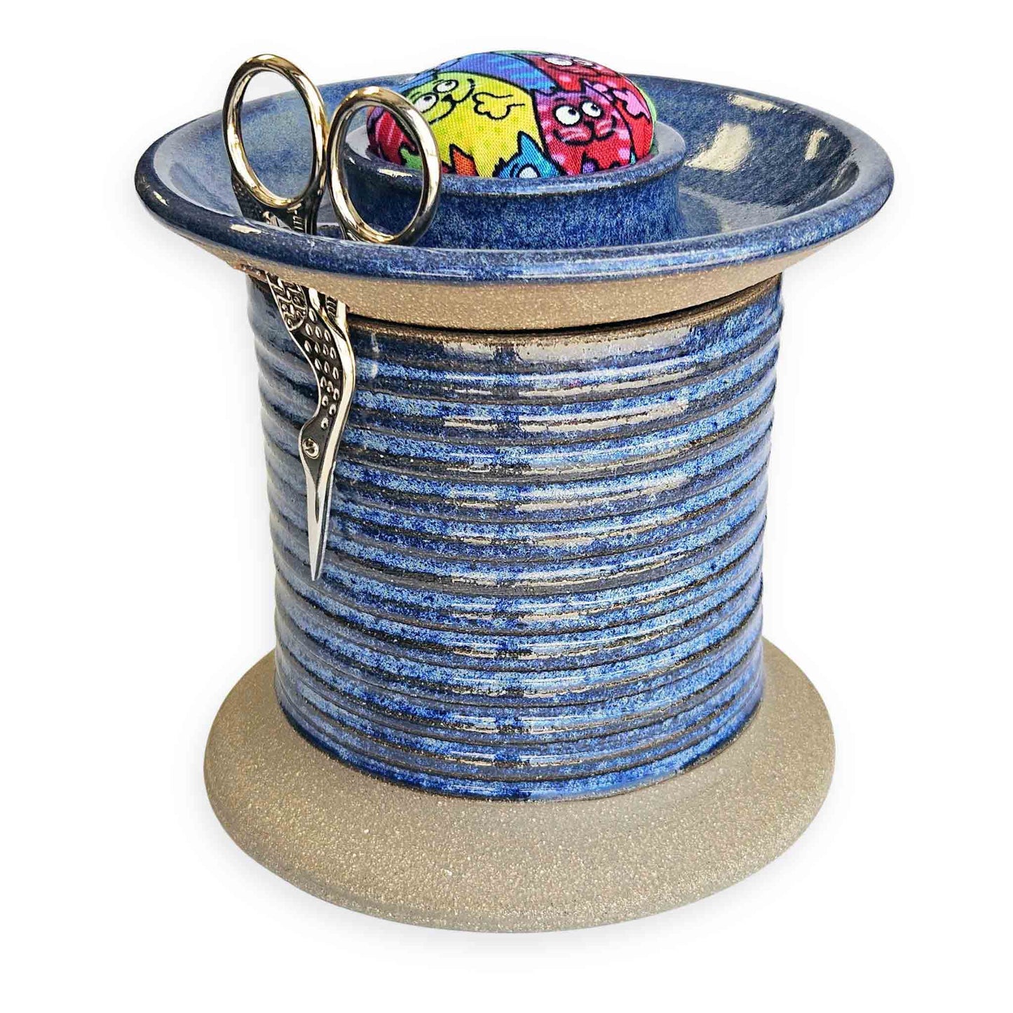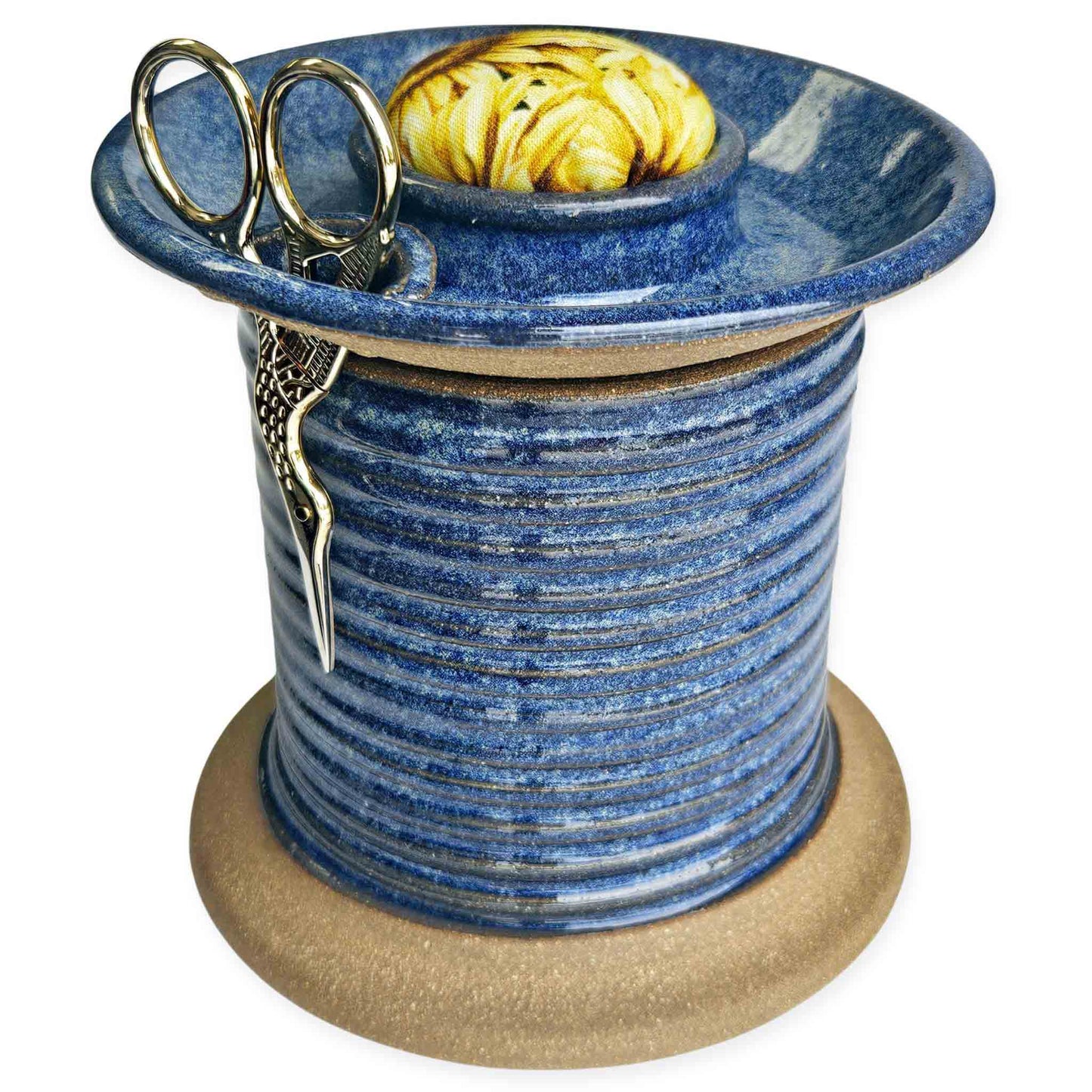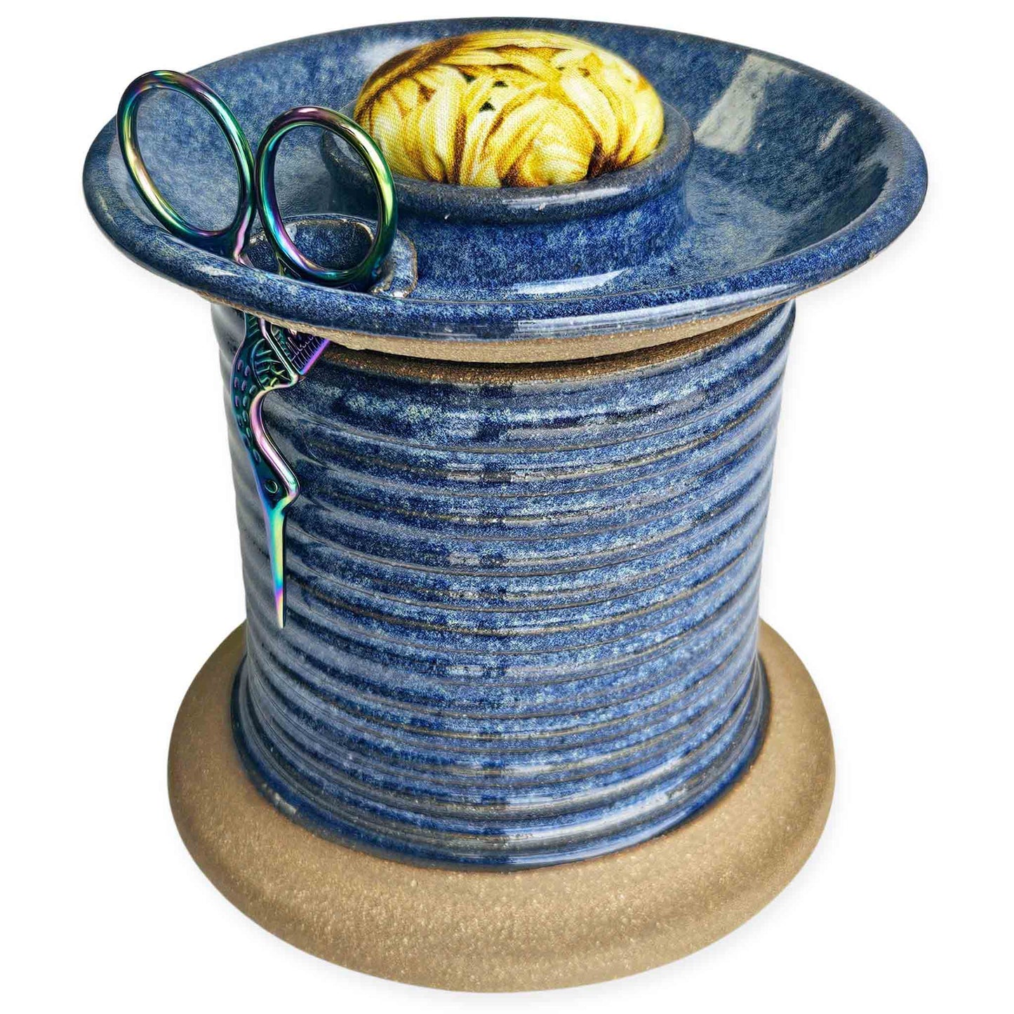 Get your hands on our Blue 'Sewing Station Caddy,' the ultimate sewing companion for everyone from tailoring professionals to occasional menders. Handmade with love and expertise, this oversized spool shaped caddy serves as an attractive and functional storage for sewing implements so you can stylishly keep your scissors, pins, tape measure, and other notions at hand. The artistic choice for those looking to gift something unique and purposeful to moms, grandmothers, sisters, friends, Ravelry buddies, fashion designers - anyone with a soft spot for sewing!