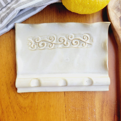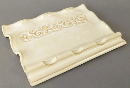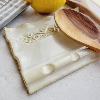 Add warmth and vintage charm to your kitchen with this handcrafted triple spoon rest in a creamy farmhouse glaze. A must-have for cooks who love a clean, inviting stovetop, it keeps three utensils organized at once—perfect for soup nights, sauce making, or holiday baking marathons. The soft, neutral color blends beautifully with farmhouse, French country, and cottage kitchens.
