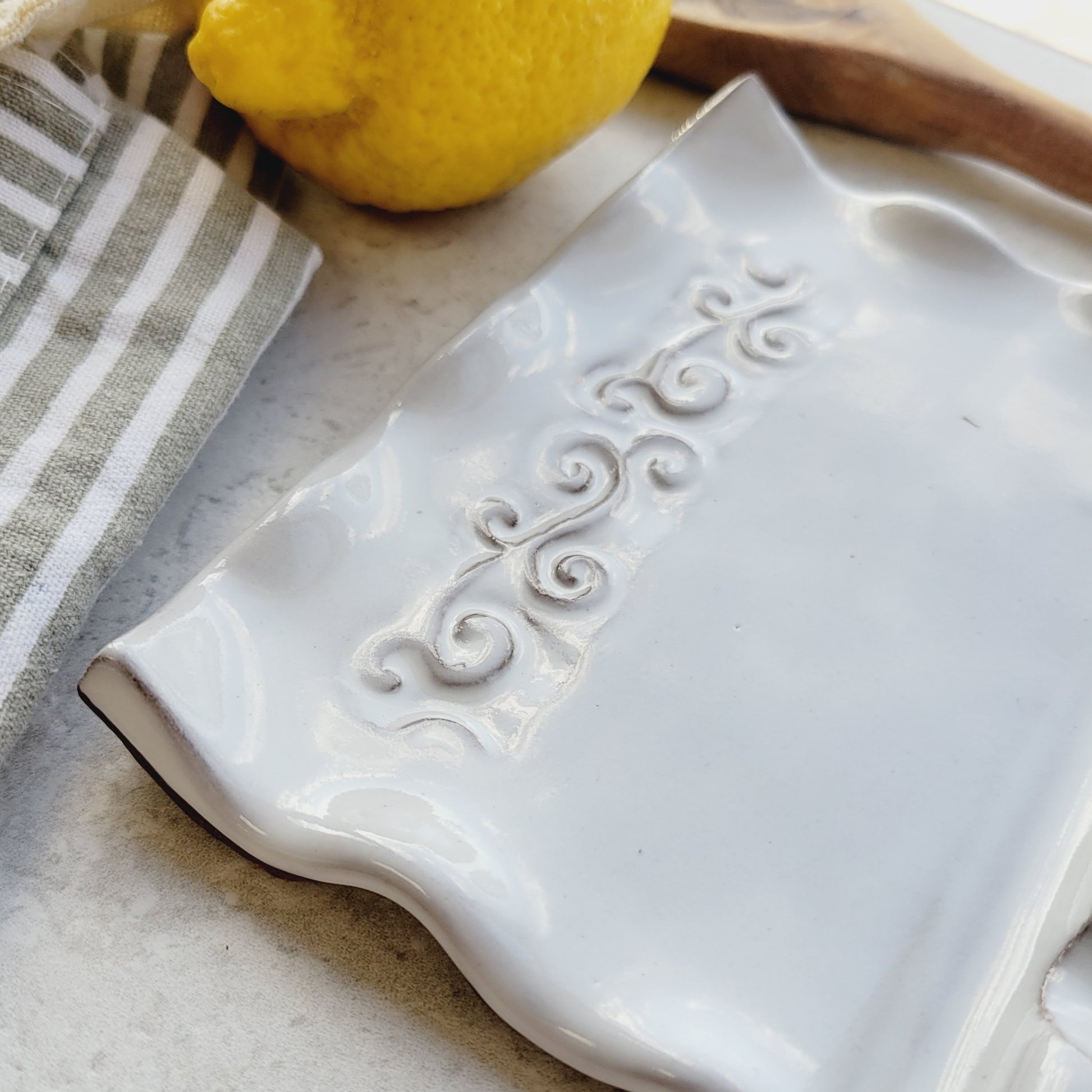 Brighten your stovetop with this handcrafted triple spoon rest in crisp farmhouse white. Designed for cooks who appreciate clean lines and all-white kitchens, it keeps three utensils organized while blending seamlessly into modern farmhouse, minimalist, or coastal spaces. A fresh, functional upgrade you’ll reach for every day.